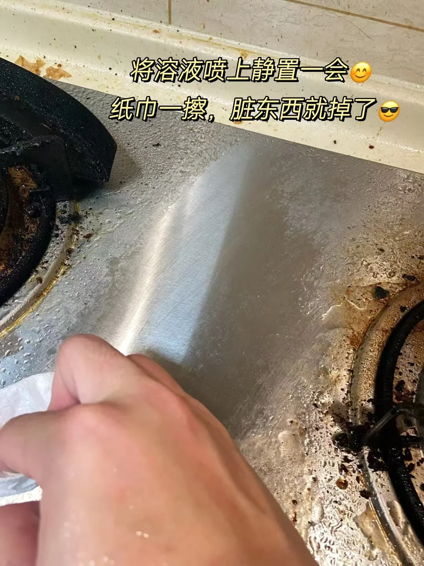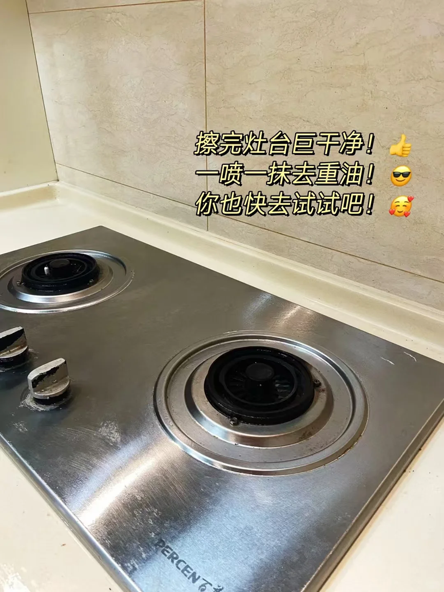 就可以将煤气灶周围的油污清理的干干净净了,而且味道又不刺鼻,非常的环保。