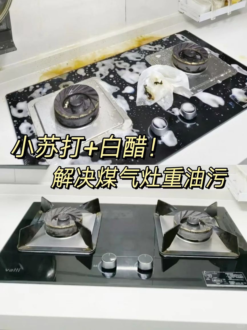 将小苏打、白醋和温水放在一起摇晃均匀之后,喷洒在煤气灶旁边有油污的地方,然后静置一会儿再使用纸巾一擦脏东西就掉了。