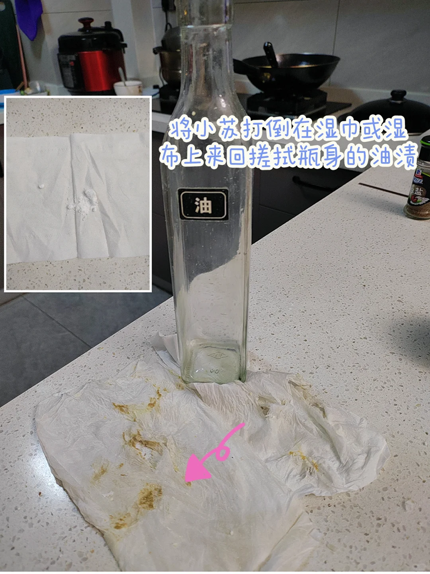 至于油壶外面的污渍,大家可以直接将小苏打倒在湿巾或者是湿抹布上,然后来回的进行擦拭,就能够将瓶身表面的油渍清理干净。