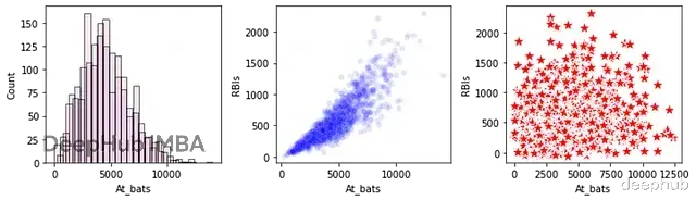 真实数据(蓝色圆点)和合成数据(红色星星)的At_bats与RBIs分布