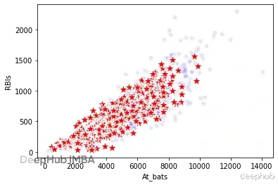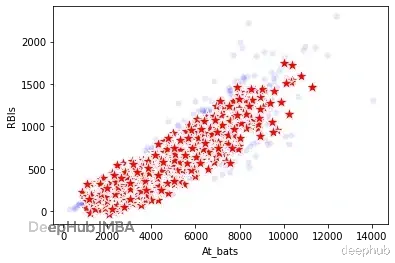 import pandas as pd import numpy as np from sklearn.datasets import fetch_openml import matplotlib.pyplot as plt import seaborn as sns from sklearn.mixture import GaussianMixture from sklearn.ensemble import IsolationForest # Load the data data = fetch_openml('baseball', version=1, parser='auto') df = pd.DataFrame(data.data, columns=data.feature_names) df['Strikeouts'] = df['Strikeouts'].fillna(df['Strikeouts'].median()) # Clean the data of strong outliers df = pd.get_dummies(df) np.random.seed(0) clf_if = IsolationForest() clf_if.fit(df) pred = clf_if.decision_function(df) trimmed_df = df.loc[np.argsort(pred)[50:]] # Determine the best number of clusters to use best_score = np.inf best_n_clusters = -1 for n_clusters in range(2, 10): gmm = GaussianMixture(n_components=n_clusters) gmm.fit(trimmed_df) score = gmm.bic(trimmed_df) if score < best_score: best_score = score best_n_clusters = n_clusters # Fit a GMM gmm = GaussianMixture(n_components=best_n_clusters) gmm.fit(trimmed_df) # Use the GMM to generate synthetic data samples = gmm.sample(n_samples=500) synth_df = pd.DataFrame(samples[0], columns=df.columns) # Plot two columns as a 2d scatterplot sns.scatterplot(data=df, x="At_bats", y="RBIs", color='blue', alpha=0.1) sns.scatterplot(data=synth_df, x="At_bats", y="RBIs", color='red', marker="*", s=200) plt.show()