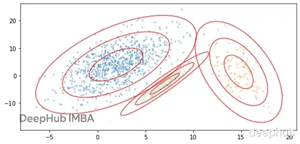 每个簇中心周围的同心椭圆环代表距离中心那么远的位置被生成的概率(越靠近中心概率越高)。之所以是椭圆不是圆,因为GMM考虑数据的形状(通过协方差矩阵):某些特征相关的话,簇往往呈现椭圆形而非圆形。