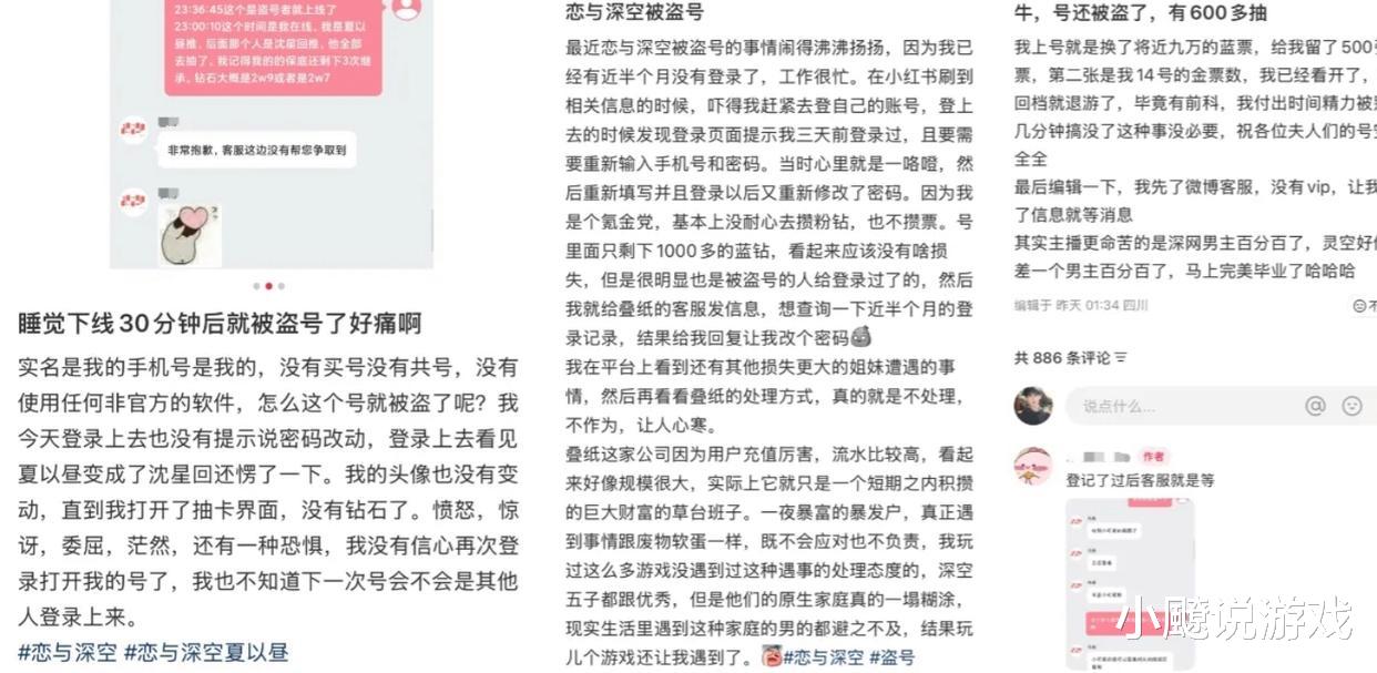 小飉在小红书、微博等社交平台上刷到大量关于《恋爱与深》游戏账号被盗取,被毁坏等帖子,其中有一条信息说是有位女玩家为抽到《恋与深空》周年限定卡连续熬夜两周,此刻却眼睁睁看着账号里所有男主服装被替换成初始款,抽卡记录被清空。
