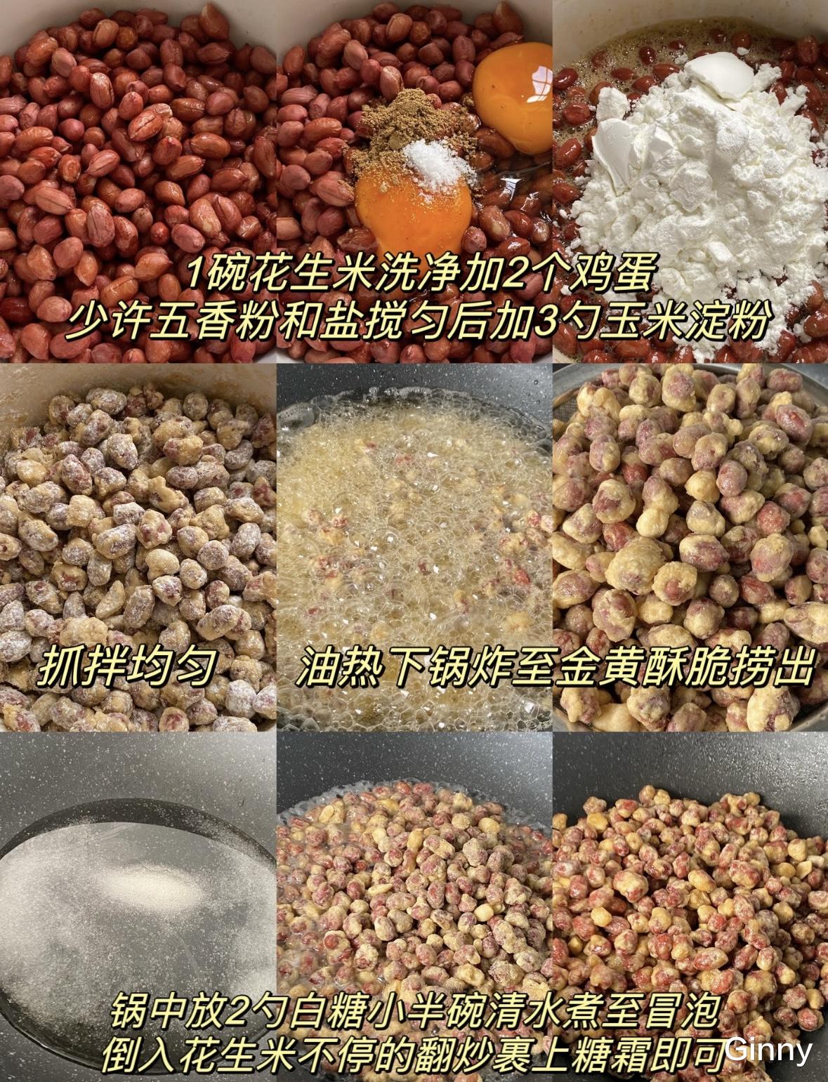 做法超简单👉 1碗花生米洗净,加2个鸡蛋、少许五香粉和盐搅匀,再放3勺玉米淀粉抓拌均匀🌽 油热下锅炸至金黄酥脆,捞出备用~ 另起锅放2勺白糖+小半碗清水,煮到冒泡时倒入炸好的花生米,疯狂翻炒让每颗花生都裹上糖霜🥜 过程香到邻居来敲门问是不是在搞美食直播!