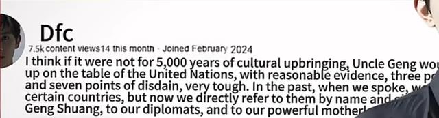 最后是一位来自中国的网表示,如果不是有5000年的文化教养,耿爽非得把脚翘到联合国的桌子上。