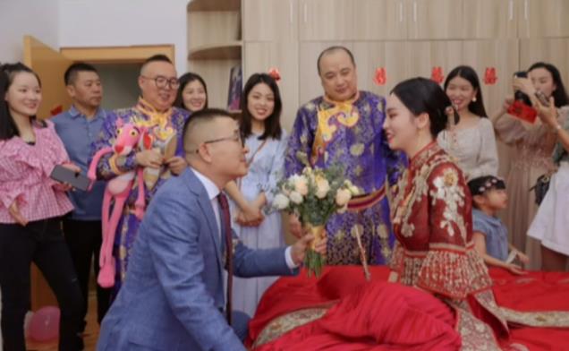 在婚礼中老刘对小萱单膝下跪,承诺以后会给予她优渥的生活和贴心的关爱。