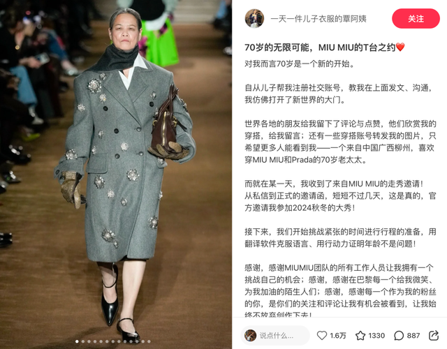 比如Miu Miu去年的秋冬大秀,邀请了一位来自中国广西柳州的素人女性覃阿姨。覃阿姨是一位年逾70的退休医生,因在社交媒体发日常穿搭而偶然走红。Miu Miu与覃阿姨的合作,不仅打破传统的少女化时尚审美,也让观众在覃阿姨身上感受到女性的多元生命力。