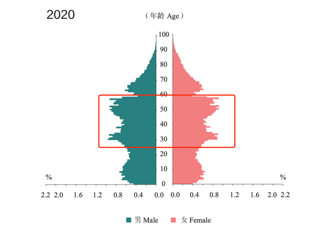 在人口金字塔中,30-65岁其实是目前占比最大的年龄群体(图为2020年第七次人口普查数据,即红框内的25-60岁人群),1995年出生的人群今年刚好迈入30岁。另有数据显示,中国人口的年龄中位数一路上涨,2025年是40.1岁,远高于世界平均。