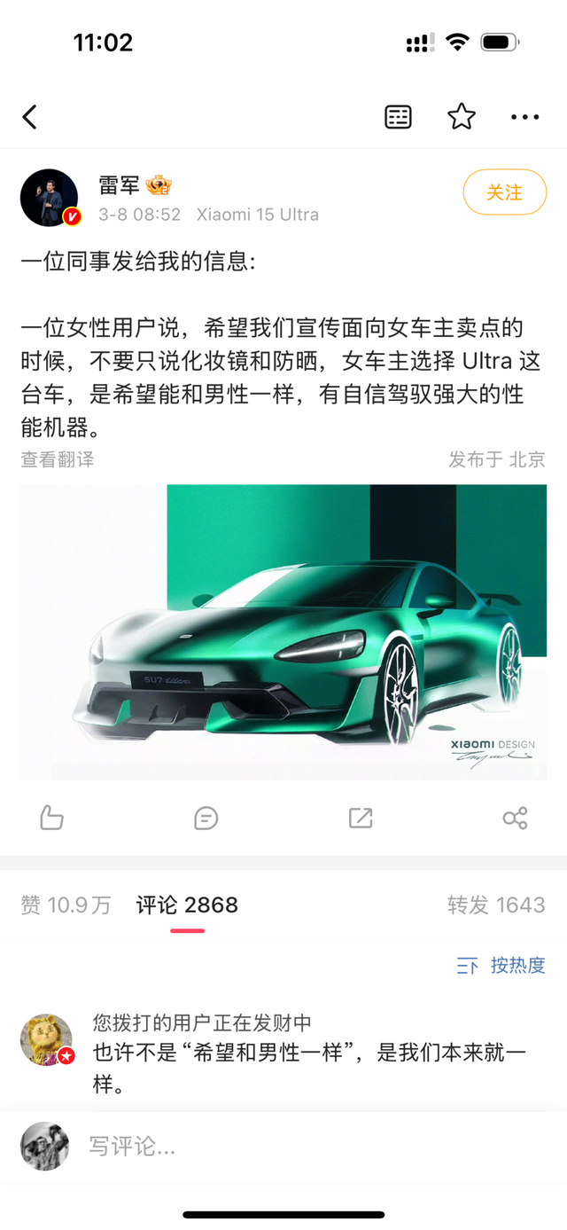 我们之前聊到过小米的女性消费者在这两年显著增加,小米SU7、YU7的女性车主比例都分别有数据称超过了四成。这可能与产品宣传时主推的防晒、颜值、收纳等有关,但进一步看,雷军小红书笔记下的高赞评论,主要讨论的是:女性用户也同样为性能、安全性买单,车辆的实际使用体验与女性用户的适配度,才是她们真正为小米汽车买单的原因。