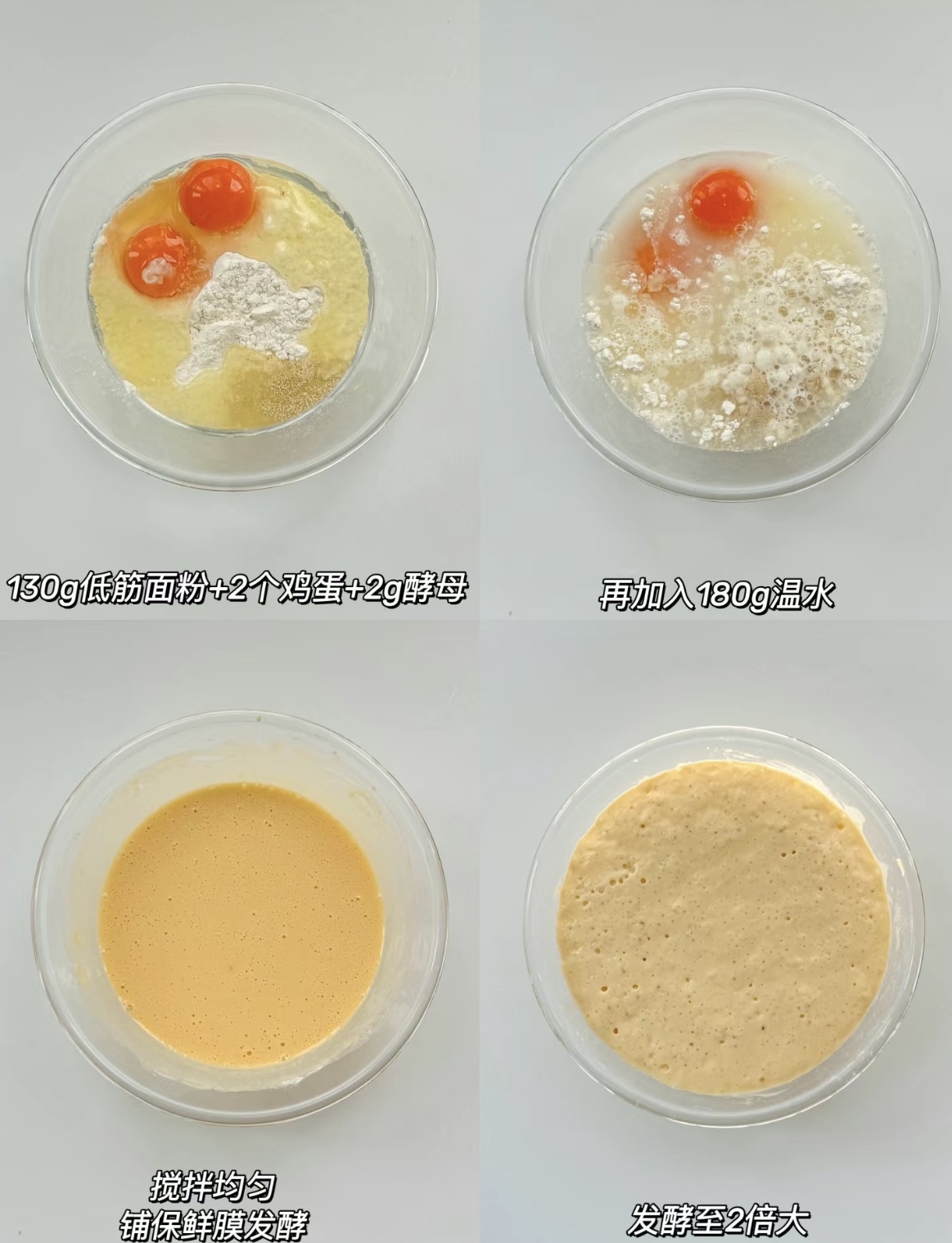 盖上保鲜膜,放置在温暖处,让面糊自然发酵至少30分钟,直到面糊体积膨胀到原来的两倍左右。