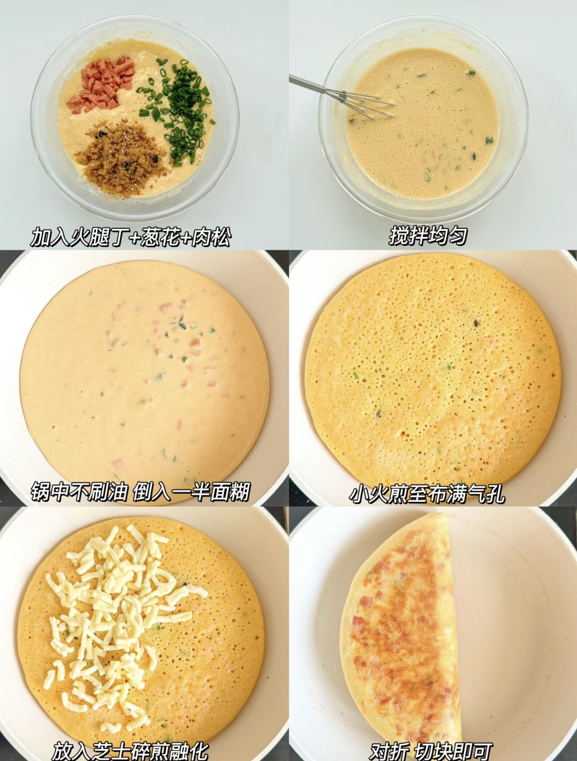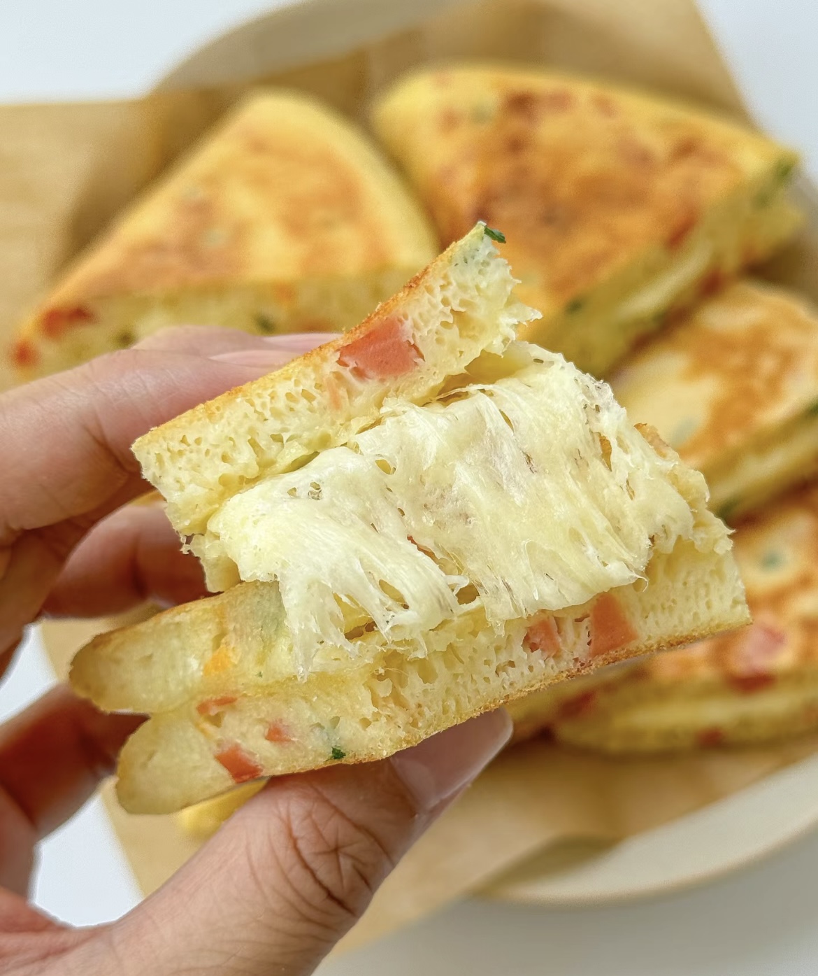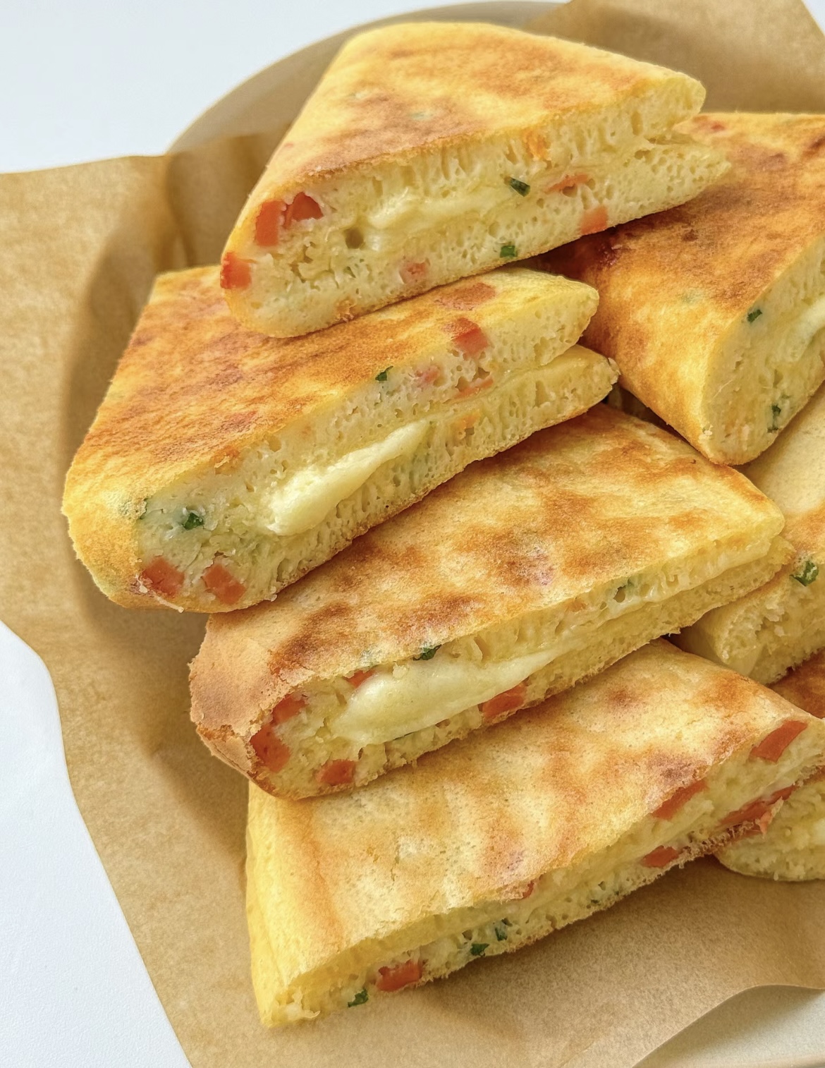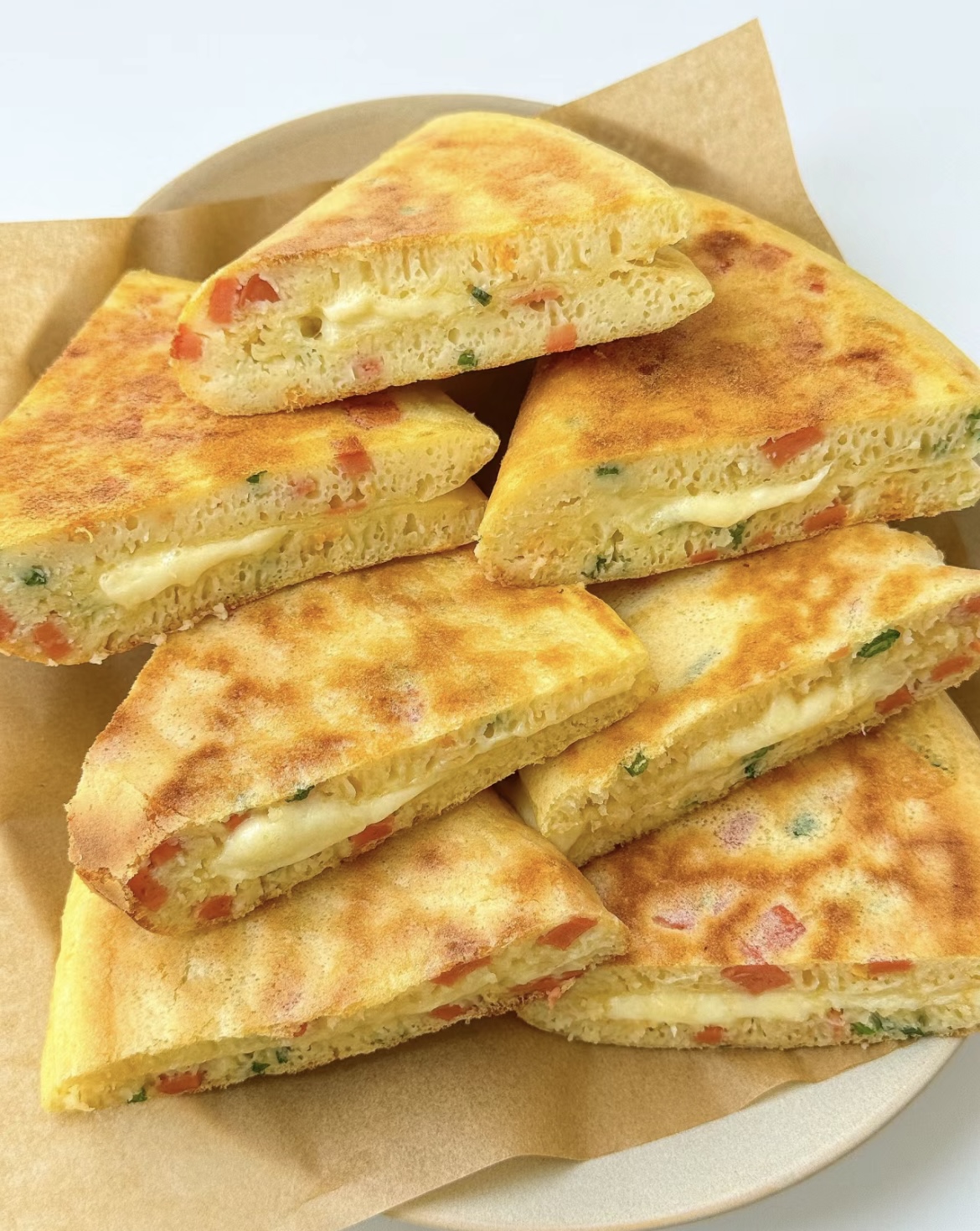 当芝士融化,且松饼整体呈现出金黄色时,小心地翻转松饼,让另一面也煎至金黄色。