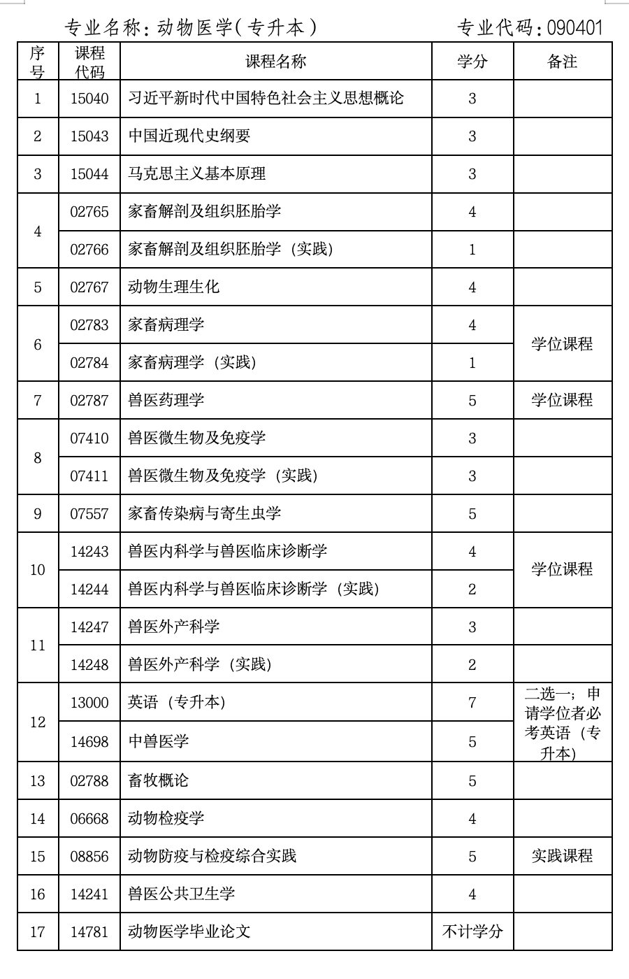 习近平新时代中国特色社会主义思想概论,中国近现代史纲要,马克思主义基本原理,家畜解剖及组织胚胎学,动物生理生化,家畜病理学,兽医药理学,兽医微生物及免疫学,家畜传染病与寄生虫学,兽医内科学与兽医临床诊断学,兽医外产科学,英语(专升本),中兽医学,畜牧概论,动物检疫学,动物防疫与检疫综合实践,兽医公共卫生学。