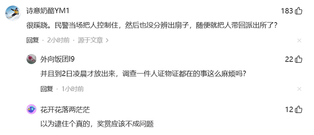 很蹊跷。民警当场把人控制住,然后也没分辨出扇子,随便就把人带回派出所了?