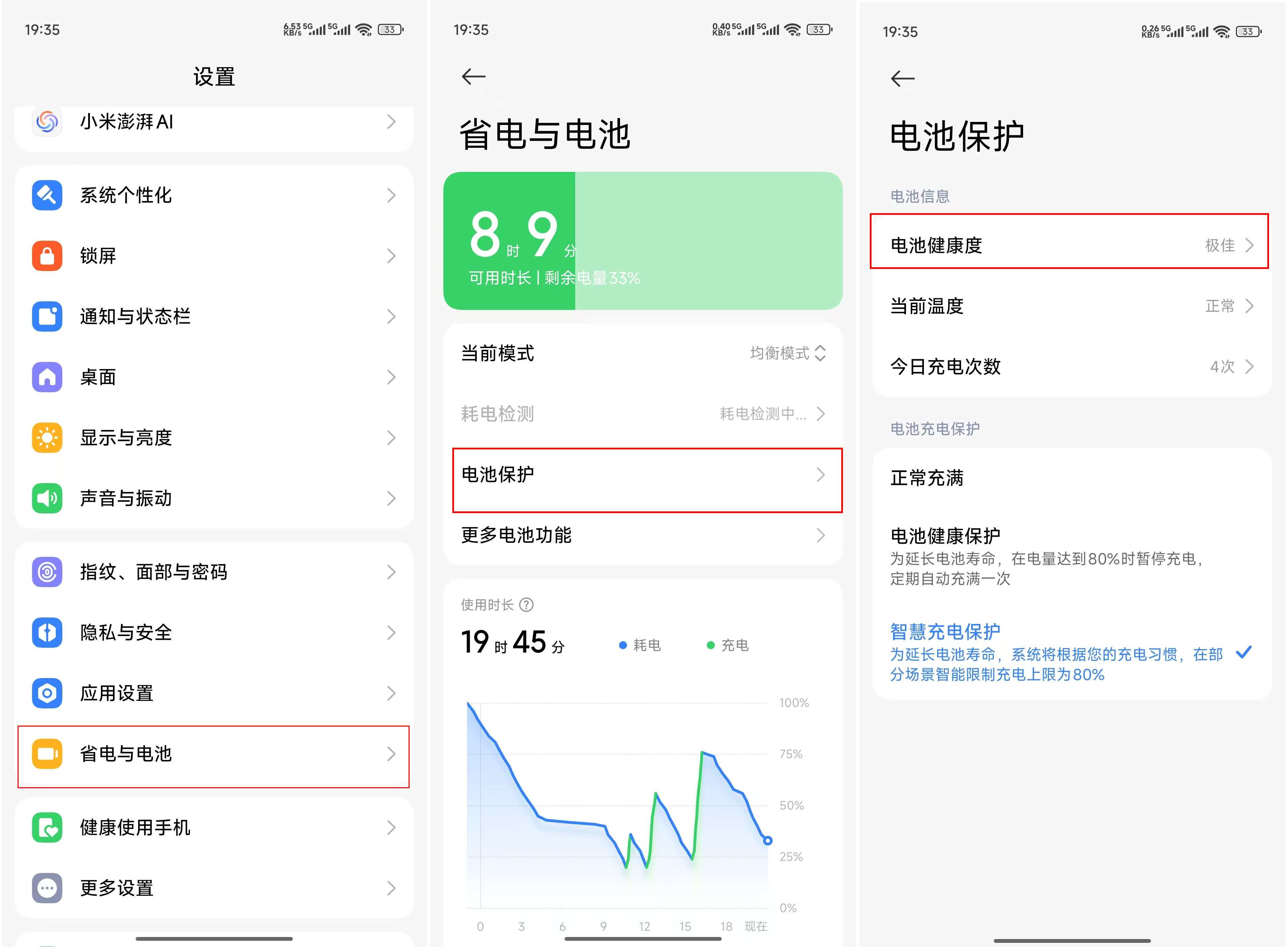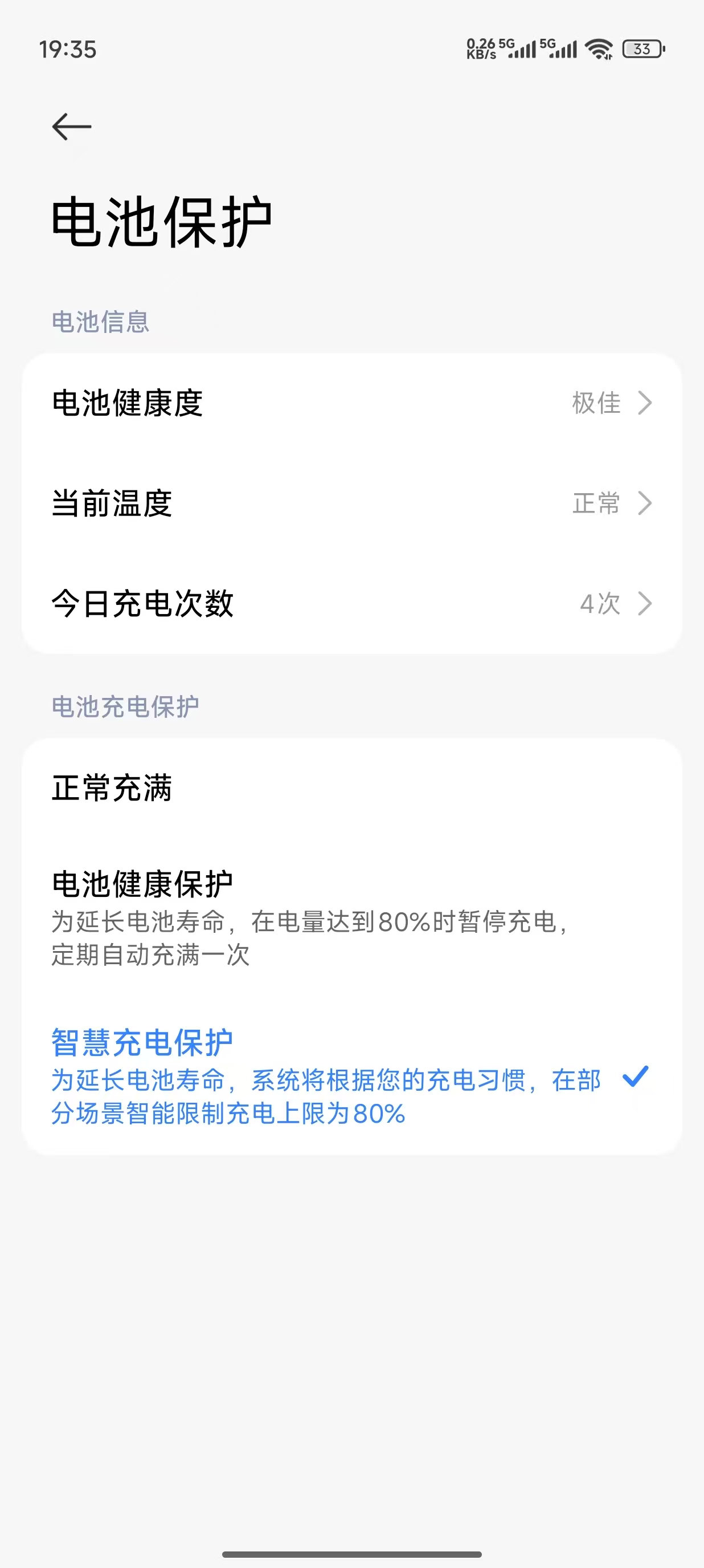 如在小米手机中可以选择电池健康保护或智慧充电保护,这两项都能增加电池的寿命,如下图。