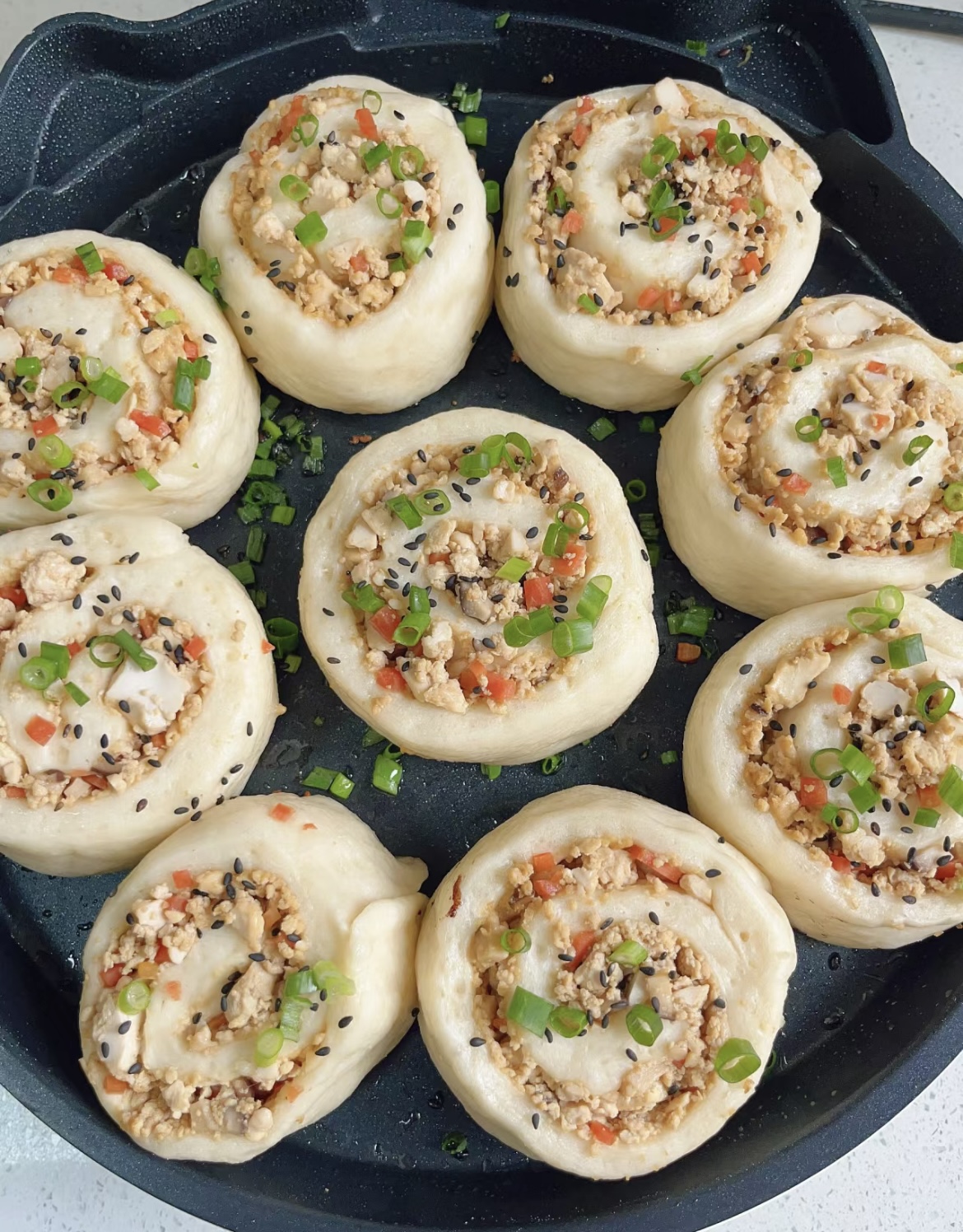 在平底锅中刷上一层薄油,将切好的豆腐蔬菜卷放入锅中,排列整齐。