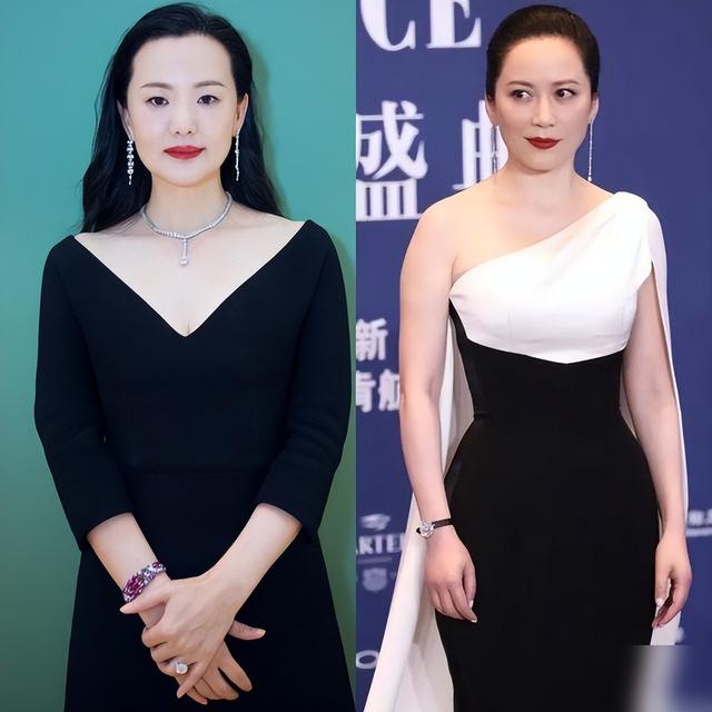 咏梅穿礼服时,肩颈、腰臀的曲线能把面料撑出自然的弧度,紫色深V裙垂坠又端庄,盘扣点缀得恰到好处,像量身定制的一样;而邬君梅的骨感身材,衣服总像“挂”在身上,再贵的面料也少了几分“人衣合一”的生动。