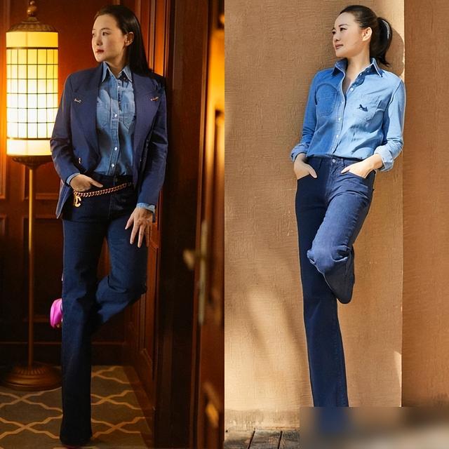 咏梅的衣柜里很少紧身衣或松垮衫,她最爱的是“松紧有度”——上半身修身收腰,下半身垂坠长裙;高腰裤配短上衣,把腰臀比“拉”得更流畅;深V领露锁骨,用纵向线条“拉长”上半身。