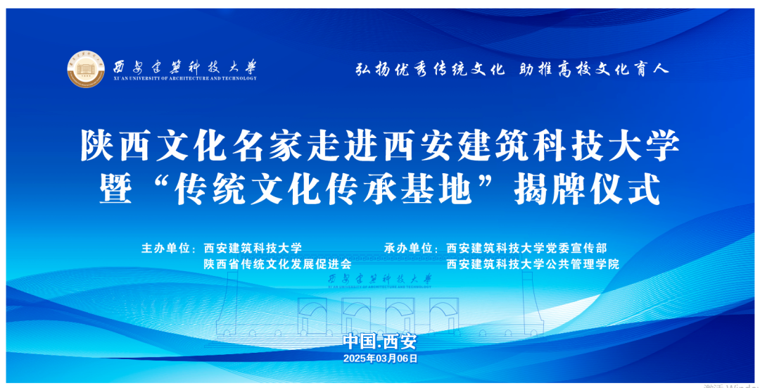 3月6日,陕西文化名家进校园暨“传统文化传承基地”揭牌仪式在西安建筑科技大学举行。陕西省人大常委会原副主任邓理、西安建筑科技大学党委书记朱晓渭,共同为“传统文化传承基地”揭牌。西安建筑科技大学党委副书记梅争利,著名文化学者、陕西省传统文化发展促进会监事商子雍分别代表双方单位致辞,著名文化学者、陕西省传统文化发展促进会终身名誉会长肖云儒为广大师生讲授《地球之虹——八万里丝路亲历故事》文化讲座,活动由陕西省传统文化发展促进会会长陈爱美、西安建筑科技大学教师费翔联合主持。