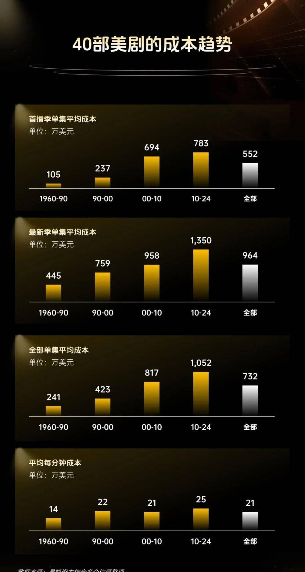其次,续季剧得舍得投钱。这40部剧平均每集花732万美元,折合每分钟21万美元。而且成本还在不断上涨,2010年后的新剧首季就要花800万美元一集,最新一季更是飙到1350万美元。虽然投入多不一定回报就高,但高回报的剧基本都集中在投入较高的那部分。