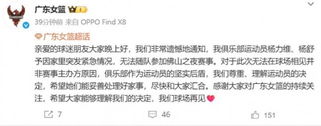 广东女篮官方公告内容如下:
