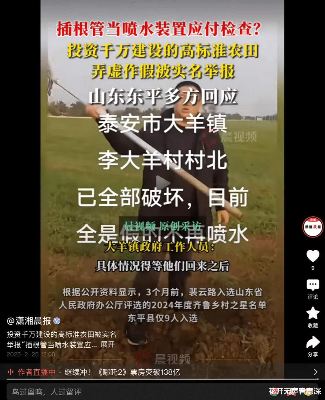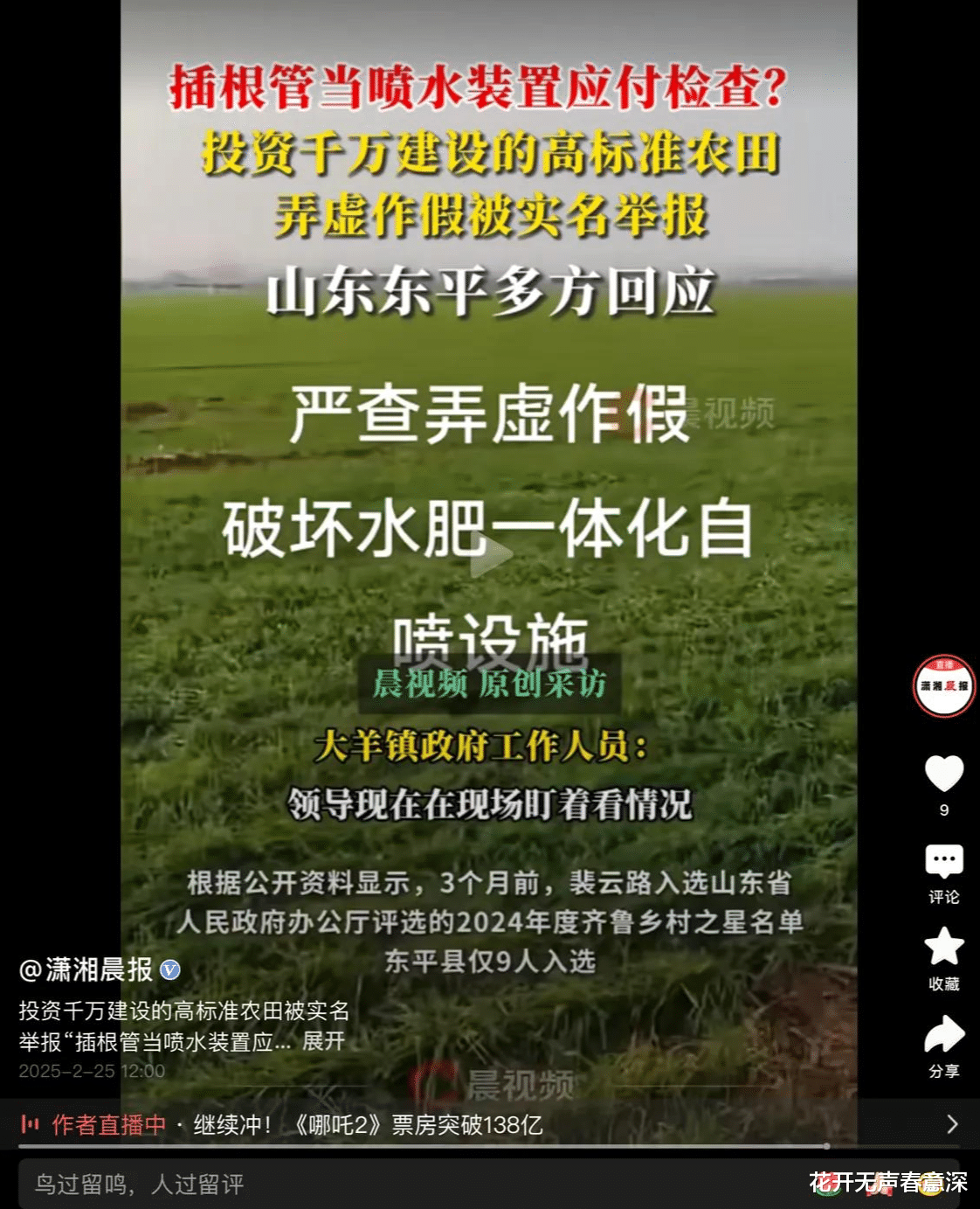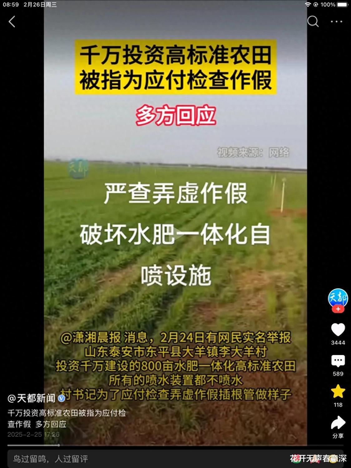 2月24号,据知名媒体潇湘晨报的报道,传来了一个相当炸裂的消息,原因是有一位来自山东泰安的网友爆料,说当地一个投资超过千万级别的高标准农田大项目,存在人为的应付性检查造假,在800多亩的农田上,所谓的自动喷水设施,竟然只是简单在地里面插了多根的管子,但实际底下是什么都没有的,更不用说什么通水灌溉。据曝光的网友,这是当地的相关负责人,应付检查,故意弄虚作假糊弄应付检查的。