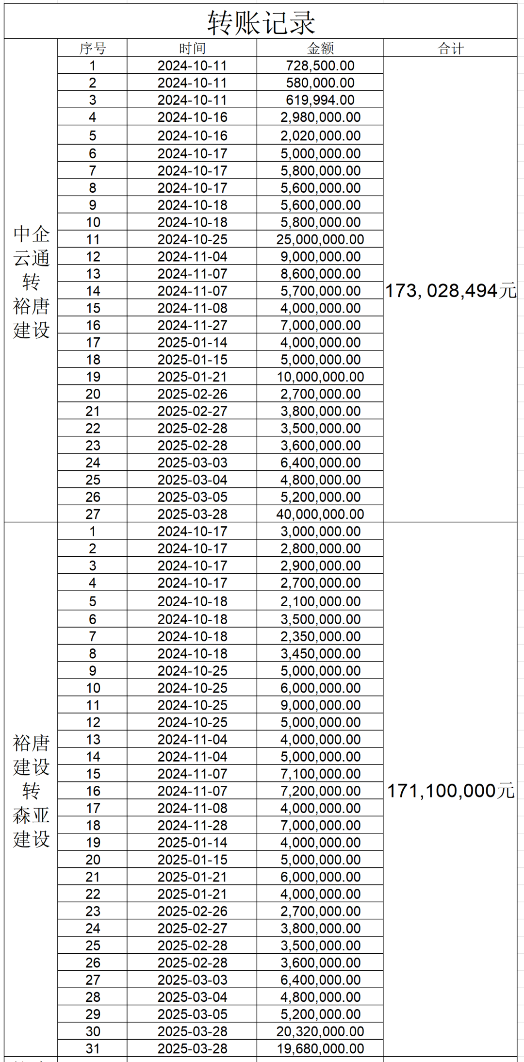 银行流水记录显示:2024年10月11日至2025年3月28日,中企云通分27次向裕唐建设转入资金共计约1.73亿元;2024年10月17日至2025年3月28日,裕唐建设分31次向森亚建设转出资金共计约1.71亿元。