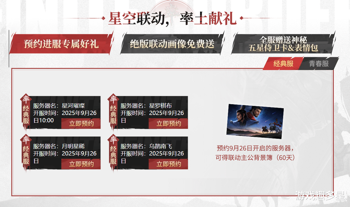 在赛季正式开启后,更有表情包、五星武将、大量虎符等阶段性奖励持续放送。最特别的是,参与预约的玩家还有机会抽取《三国的星空》电影票,国庆假期走进影院,免费观看这部由易中天亲自监制的三国动画,从大银幕到游戏沙盘,完整体验这场跨媒介的官渡之战。