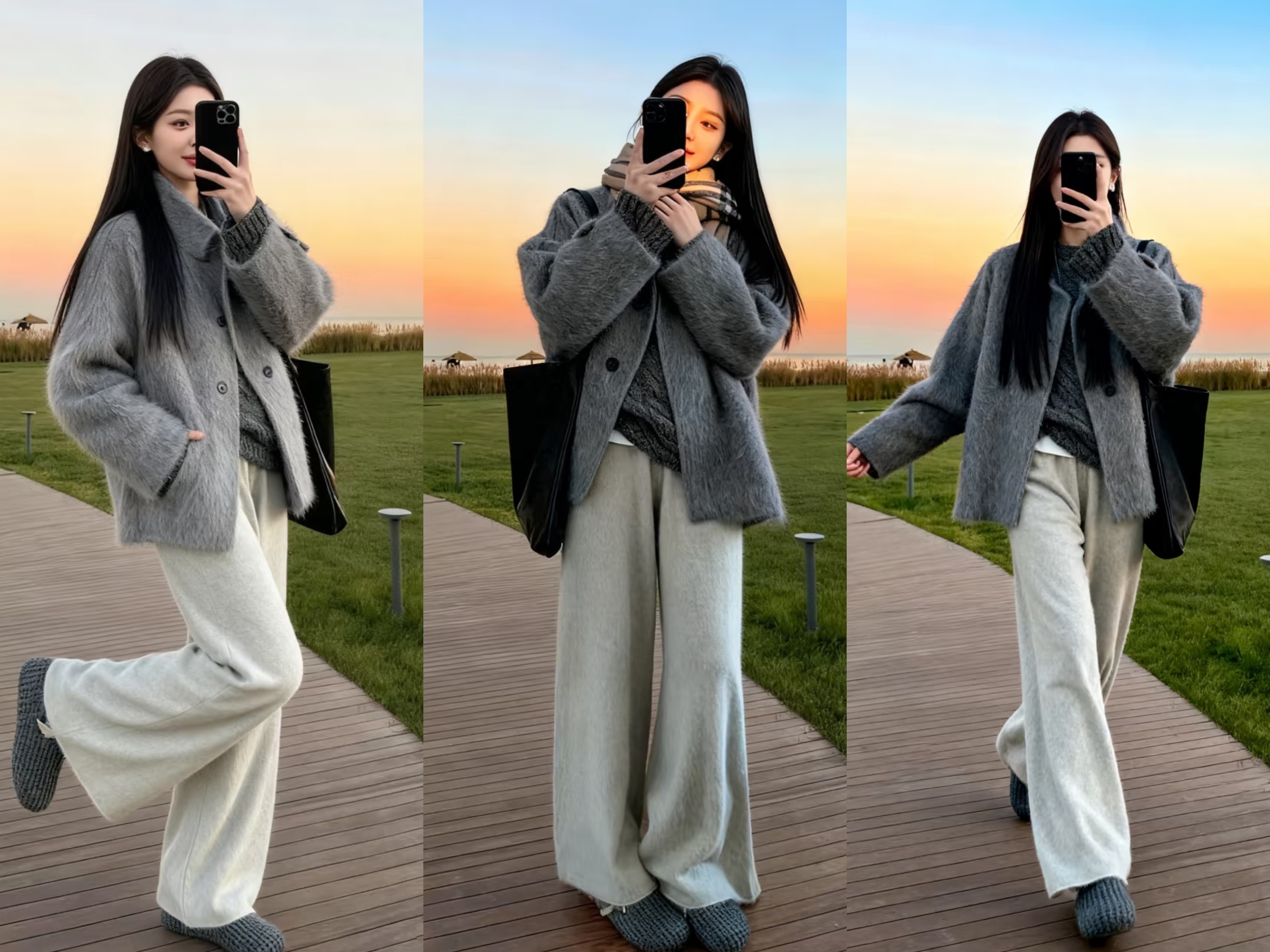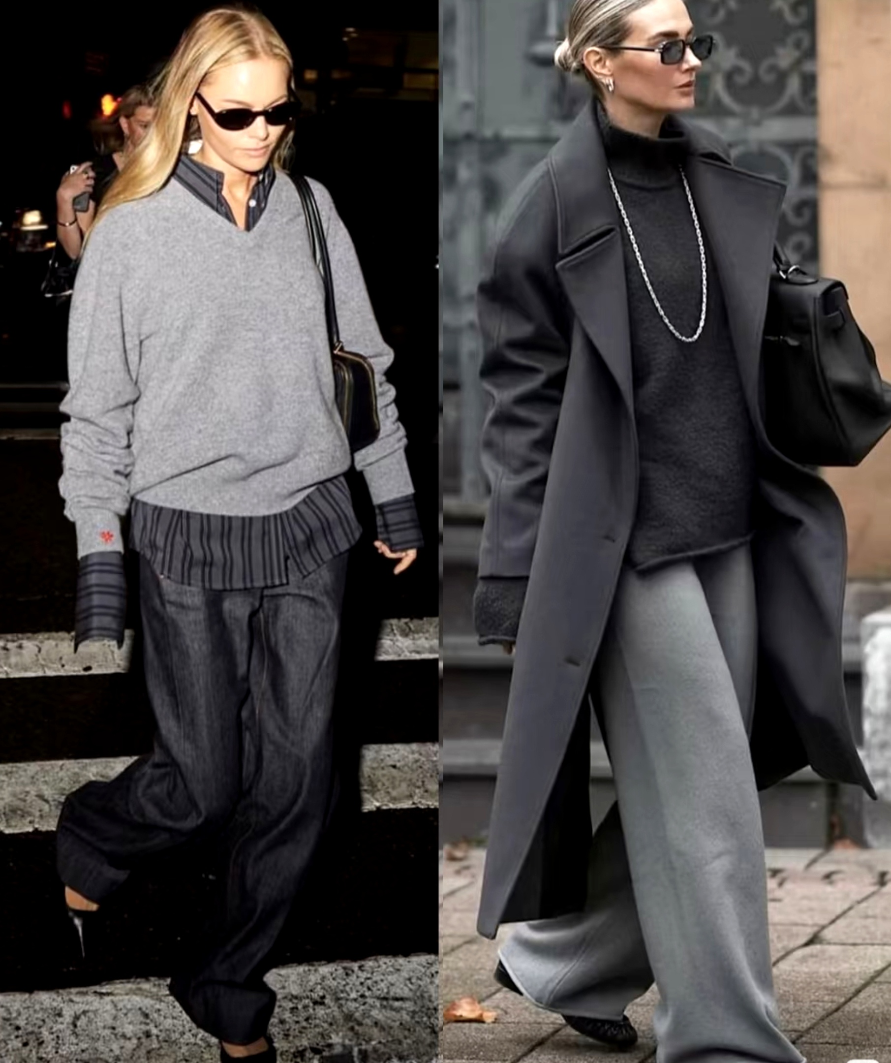 比如“上深下浅”或“上浅下深”搭配,上衣选择深灰色大衣,下装搭配灰色阔腿裤。或上衣选择灰色毛衣,下装是深灰色裤子,上下自然过渡,同色系组合却不单调,和谐有层次感。