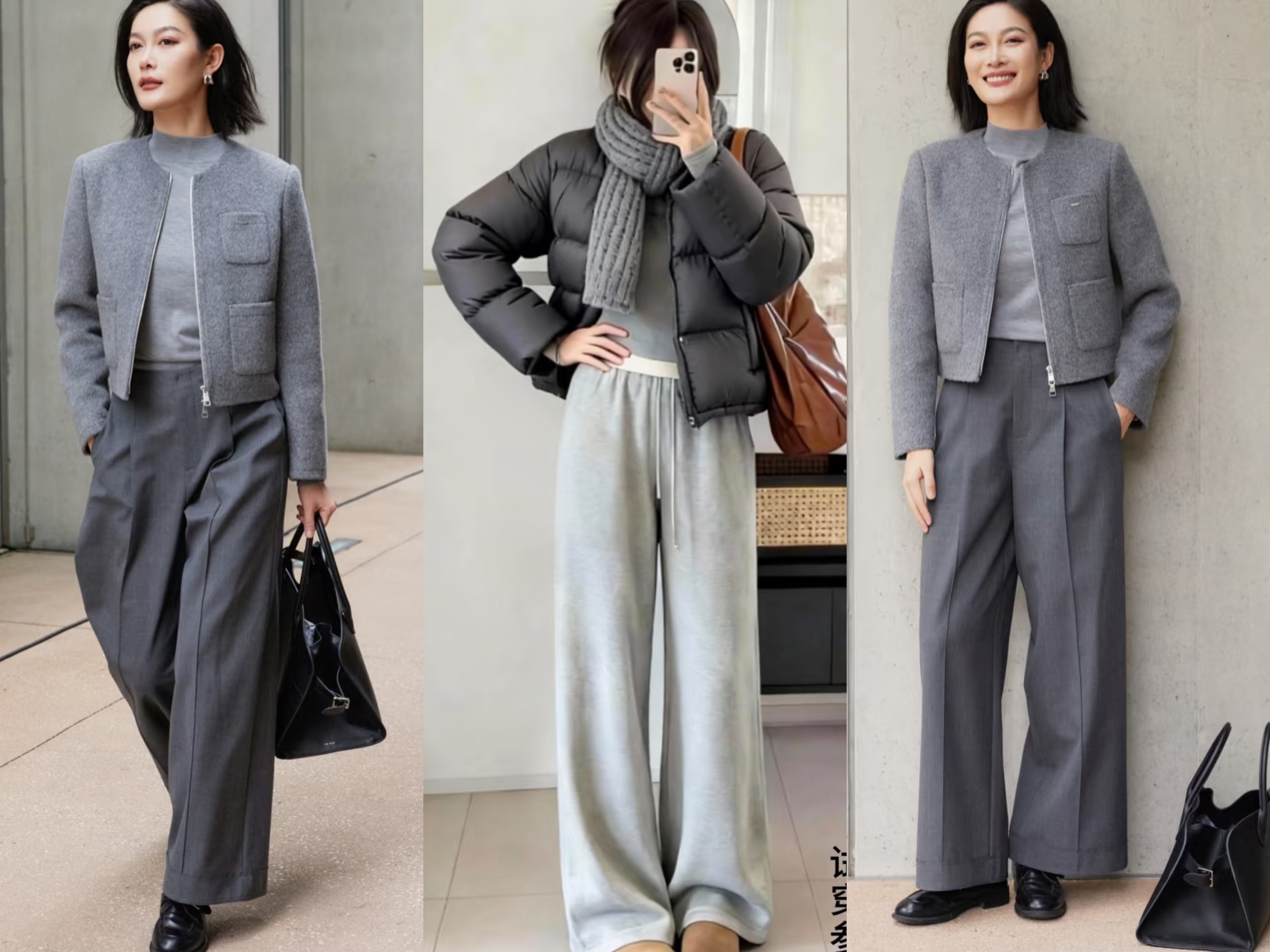 如果是上半身偏胖的女性,避免选浅灰色上衣,会放大身体缺陷。建议选择深灰色略宽松上衣,搭配浅灰色直筒裤,穿出遮肉显瘦又比例均衡的造型。