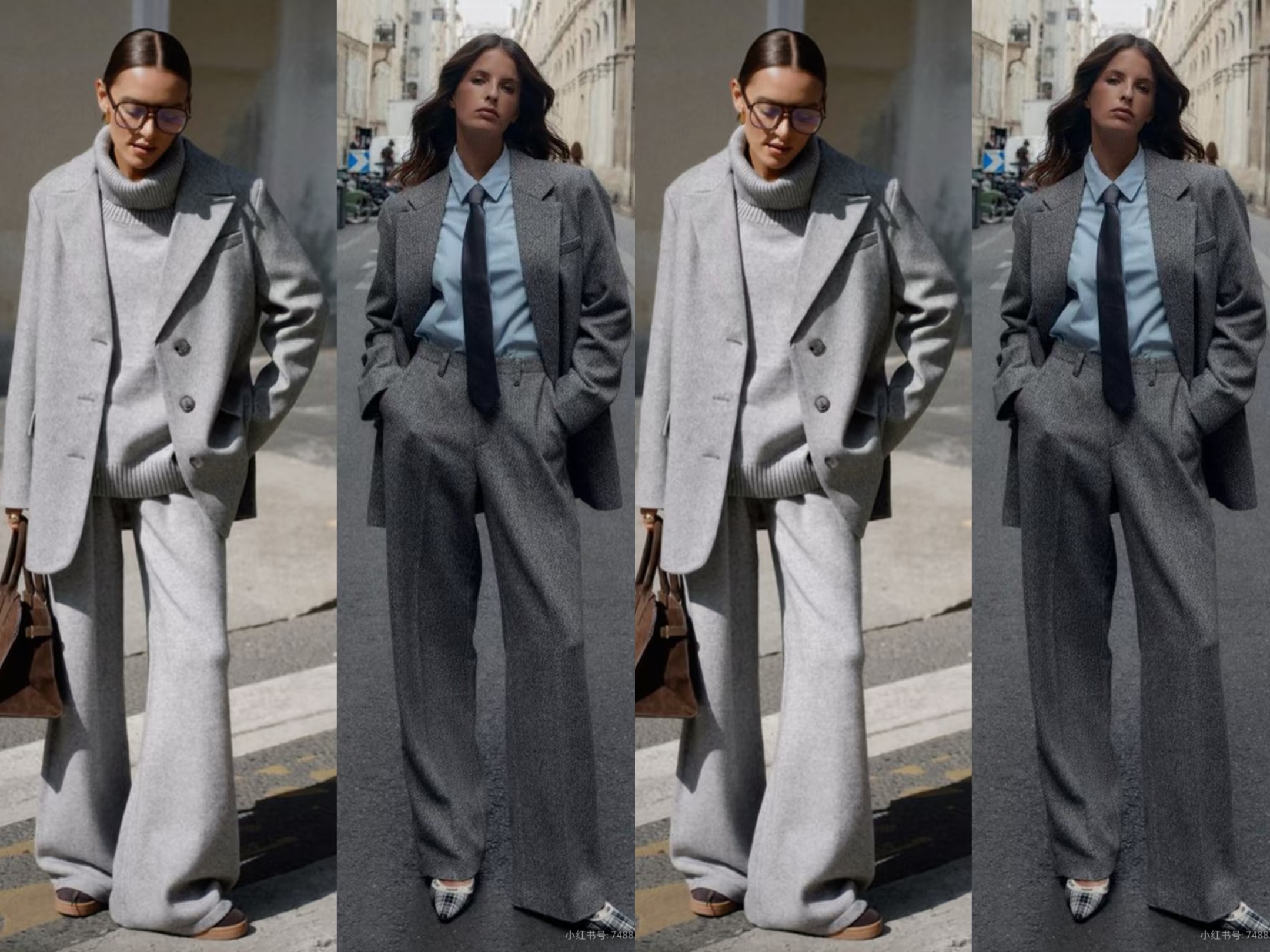 灰色同色系穿搭时,可以通过选择短款上衣或外套,抬高腰线。再搭配长度平鞋面的高腰直筒或阔腿裤,凸显修长双腿,穿出上短下长三七分黄金比例。