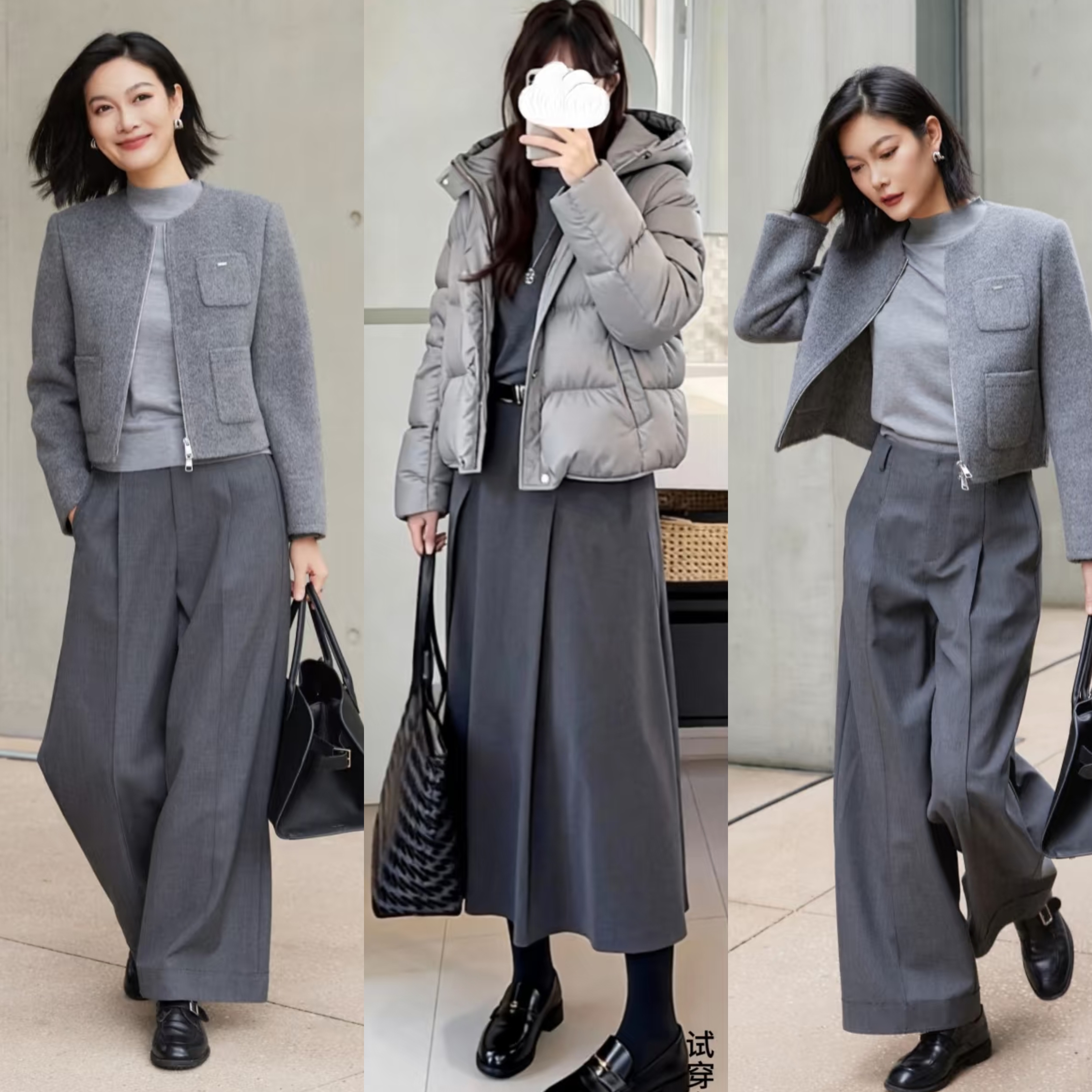 特别是四五十岁女性,对这些灰色服装喜欢程度,更胜一筹,因为职场通勤和日常休闲都适合穿着。每天一套衣服,就可以轻松切换不同场合。