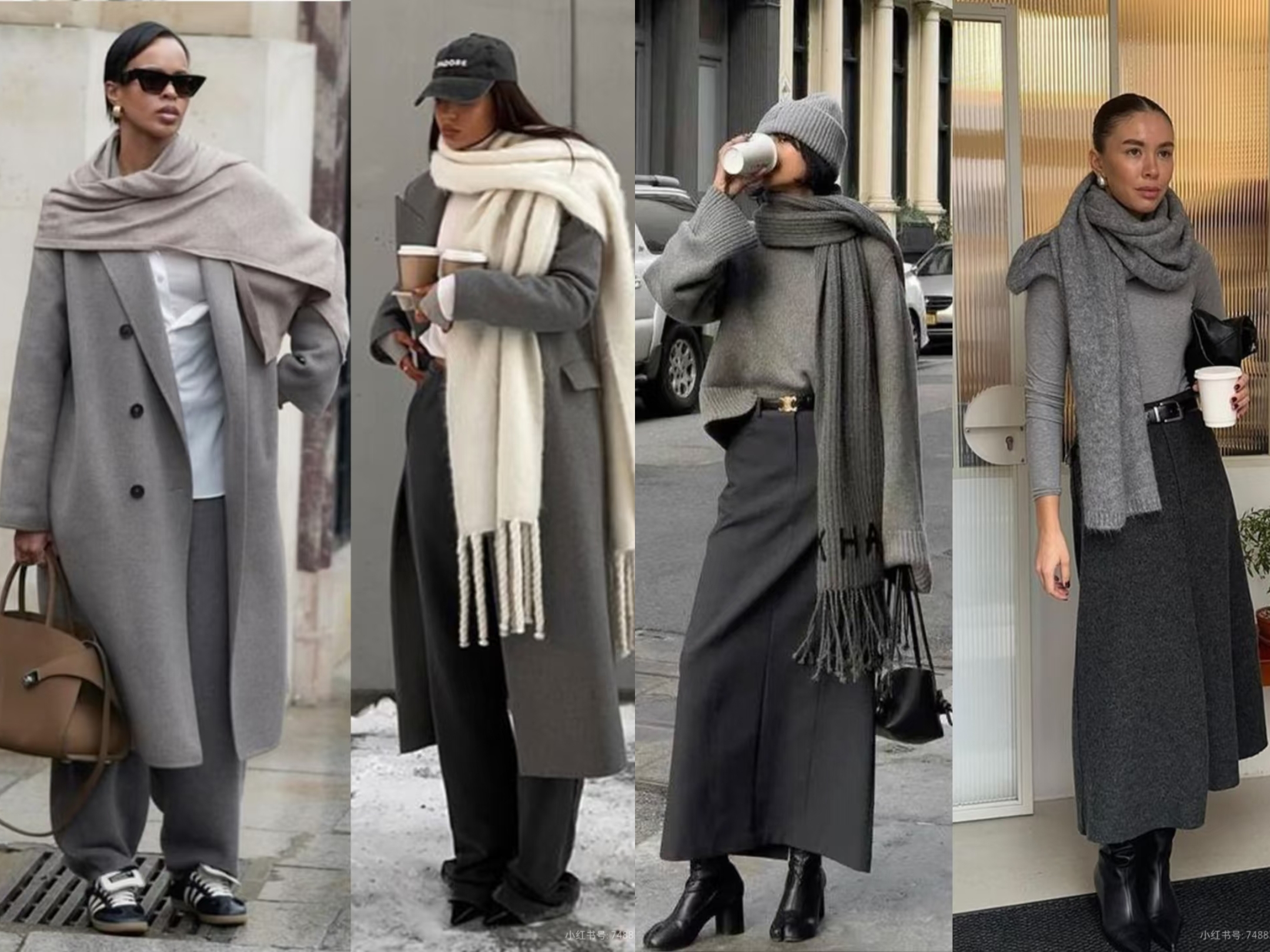 灰色同色系穿搭,要是搭配不当,造型容易显单调。这时可以利用灰色围巾或帽子搭配,增加造型层次与时尚感。即便全身颜色偏深,也不会显单调沉闷,反而穿出个性感十足造型。
