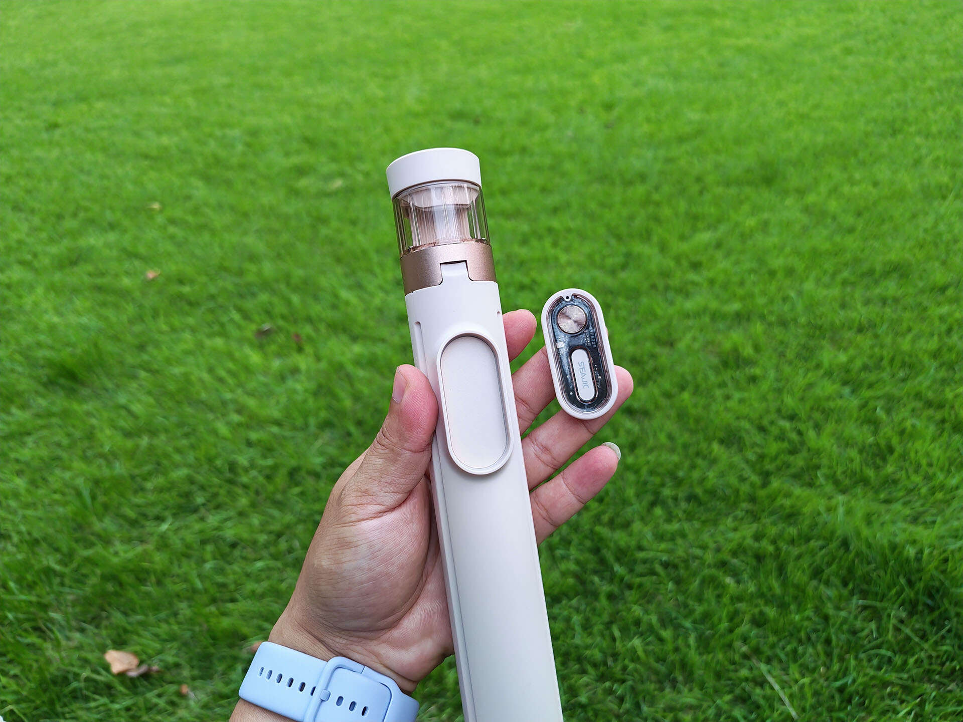 另外它的控制按钮是磁吸可以取下里的,取下来的控制器就能够变成远程遥控器了,适合把自拍杆当支架使用放地上,然后使用遥控器进行合照使用,这样就不需要麻烦陌生人了,简直就是i人最喜欢的功能。
