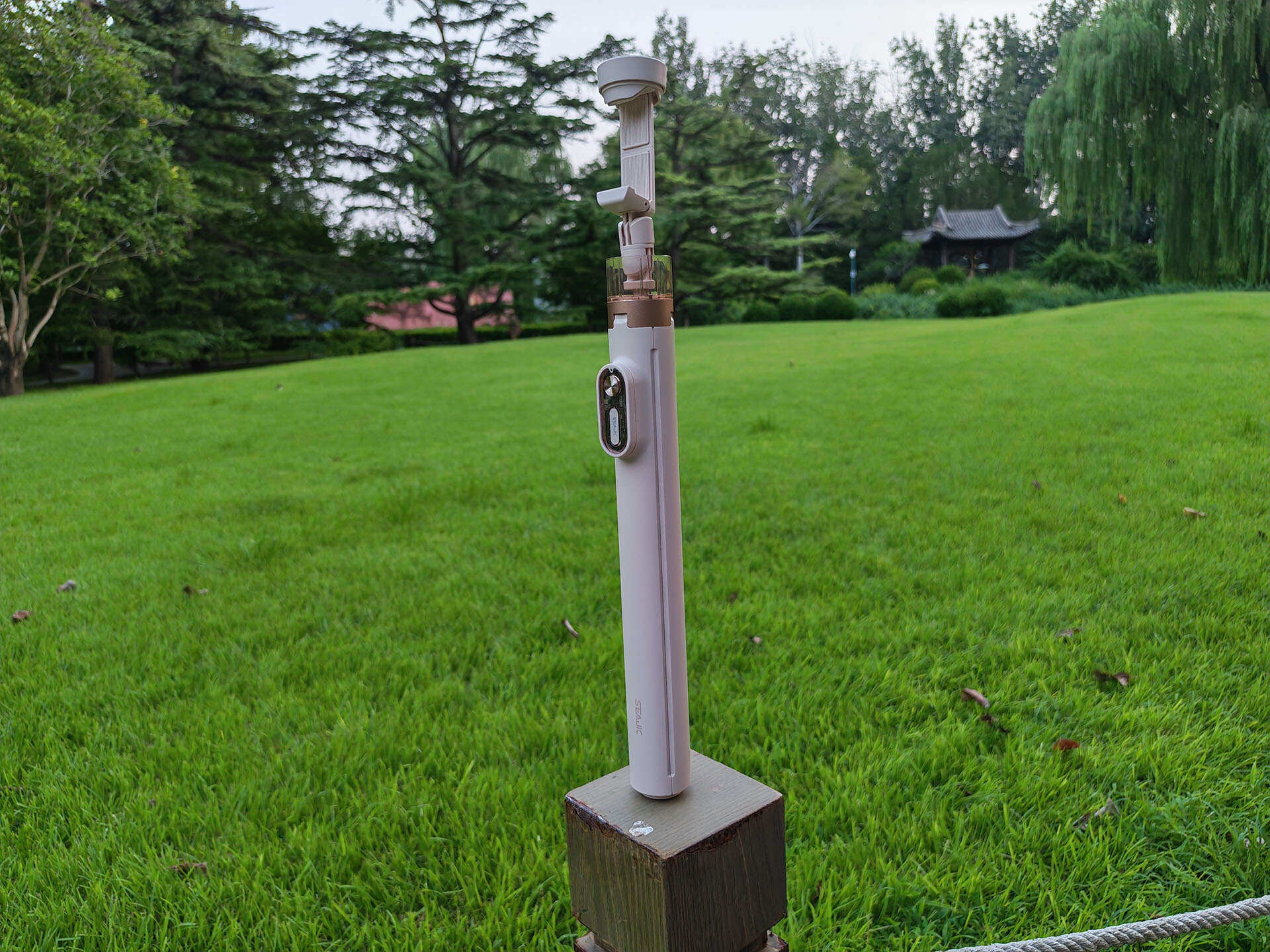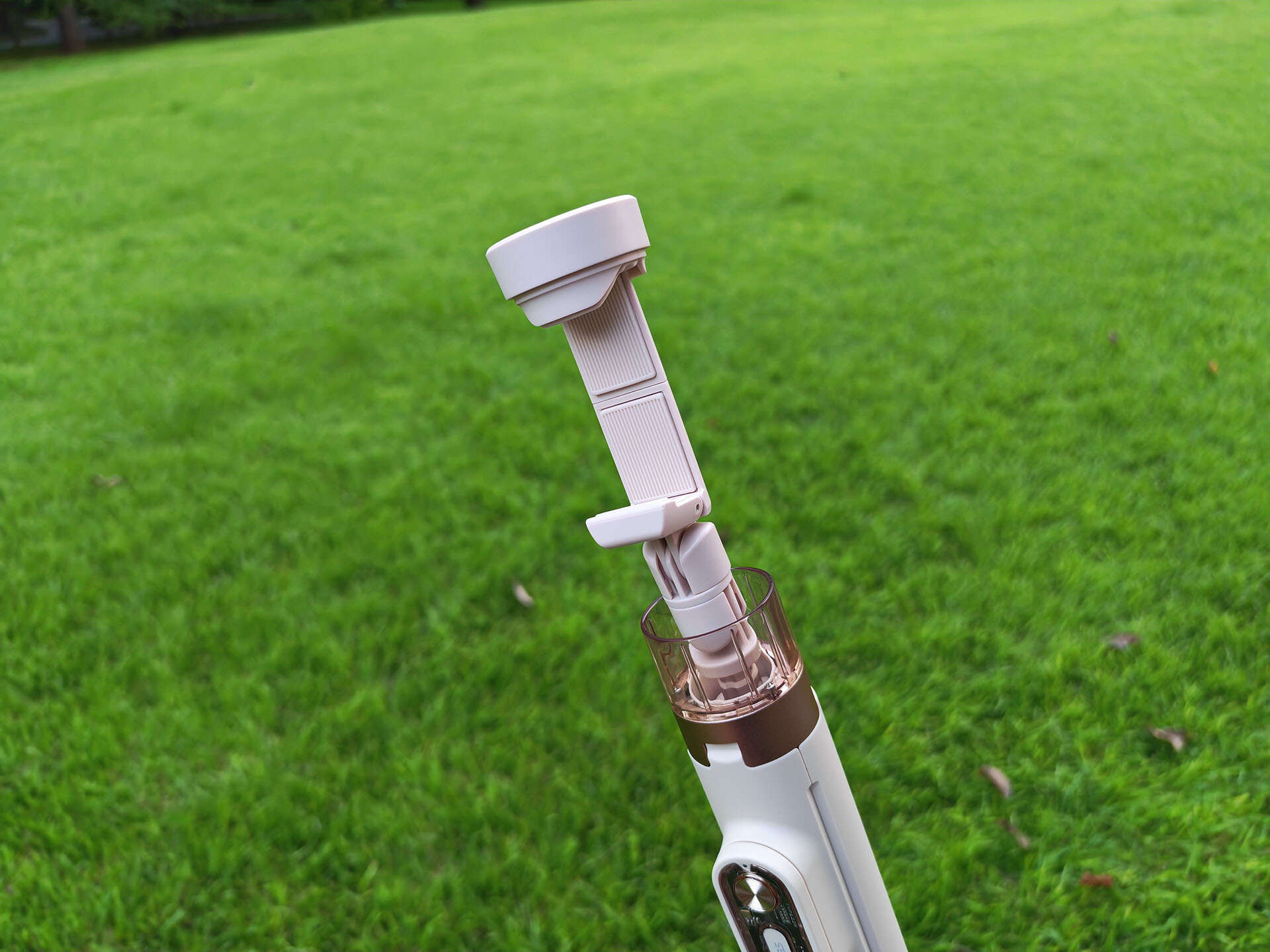 首先它的手机夹是隐藏的,杆顶的透明伸缩口内,藏着一个手机夹。用的时候拉出来,而且这个手机夹是支持360°旋转的,不管是横屏拍视频、竖屏拍照片,或者是直接仰拍天空、俯拍草地,手机夹都能精准固定角度,简直是不要太方便。