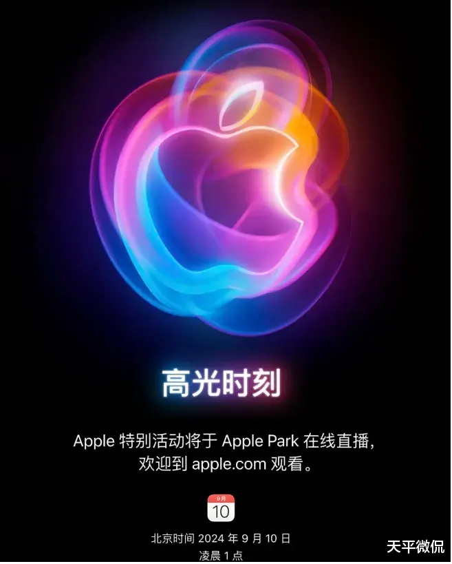 本次发布会的主题口号为“高光时刻”(英文版“It’s Glowtime”),寓意着苹果将在这场发布会上展现其最新的科技成果和创新产品。众所周知,苹果发布会的邀请函总是蕴含着丰富的彩蛋,暗示着发布会可能推出的新品、卖点以及新品的配色。而这次邀请函的设计更是别具一格,苹果logo采用了一个多彩泛光环绕的效果,与苹果新版Siri界面设计相得益彰,仿佛是在预示着一种环绕屏幕四周的多彩配色将成为新的潮流。这无疑表明,苹果今年推出的Apple Intelligence智能功能将成为iPhone 16系列新机的重要卖点之一。