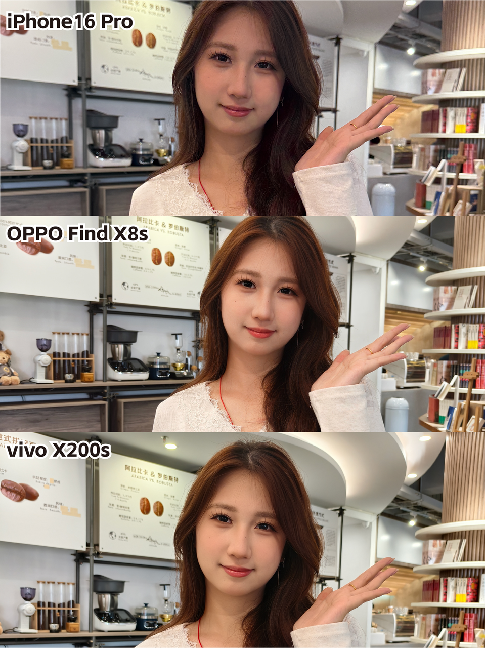 除此之外,人像拍摄方面依旧是OPPO的舒适区,Find X8s同样如此。从对比样张看,OPPO、vivo成片都是比较真实自然的美颜,而且Find X8s成片看起来更有气血感,相比iPhone的锐化,你会更喜欢哪种?