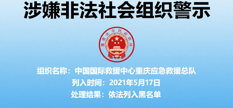 2021 年 5 月 17 日,重庆市民政局发布公告,将中国国际救援中心重庆应急救援总队列为涉嫌非法社会组织。公告明确指出,该组织未经依法登记,却擅自以社会组织名义开展活动,其行为已涉嫌违反《社会团体登记管理条例》,触碰了法律红线。两天后,上游新闻进一步报道,该总队及其下属的重庆渝中支队等四家关联组织,均已被依法列入黑名单,形成了对非法救援组织网络的集中整治。