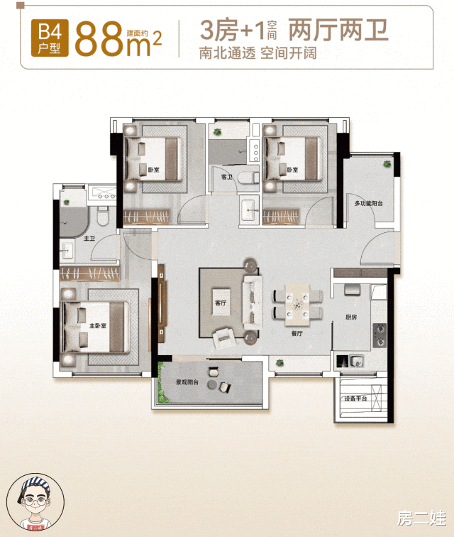 不信,我们就以它本周末要开卖的35栋为例,看看他们建面约88㎡的户型到底有多牛吧!