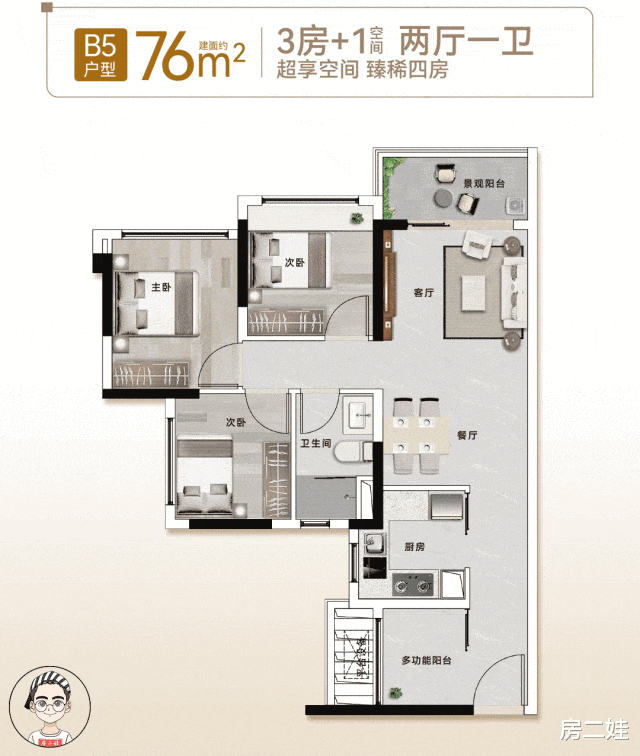 而建面约76㎡的3房+1空间,300万起,可以任选!