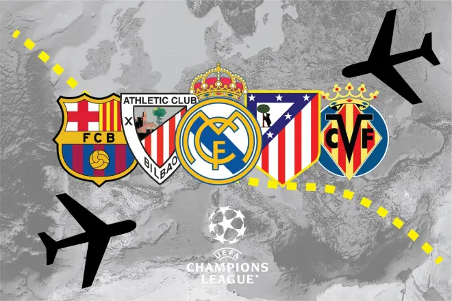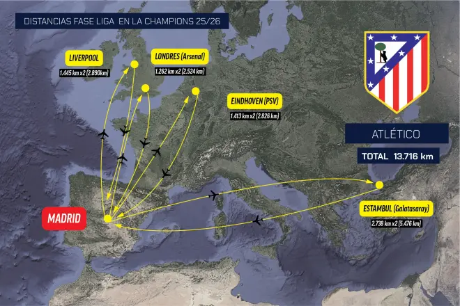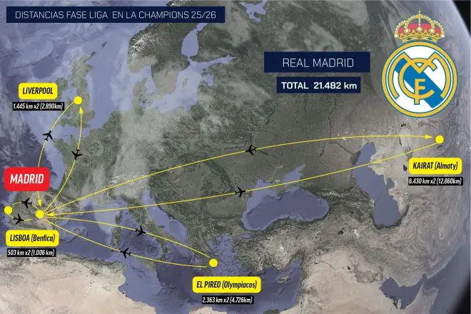 皇马本赛季的欧冠征程可谓是一场空中马拉松。除了要远征哈萨克斯坦,还需要前往希腊对阵奥林匹亚科斯(往返近4726公里)、英格兰对阵利物浦(往返2890公里)以及葡萄牙对阵本菲卡(往返1006公里)。
