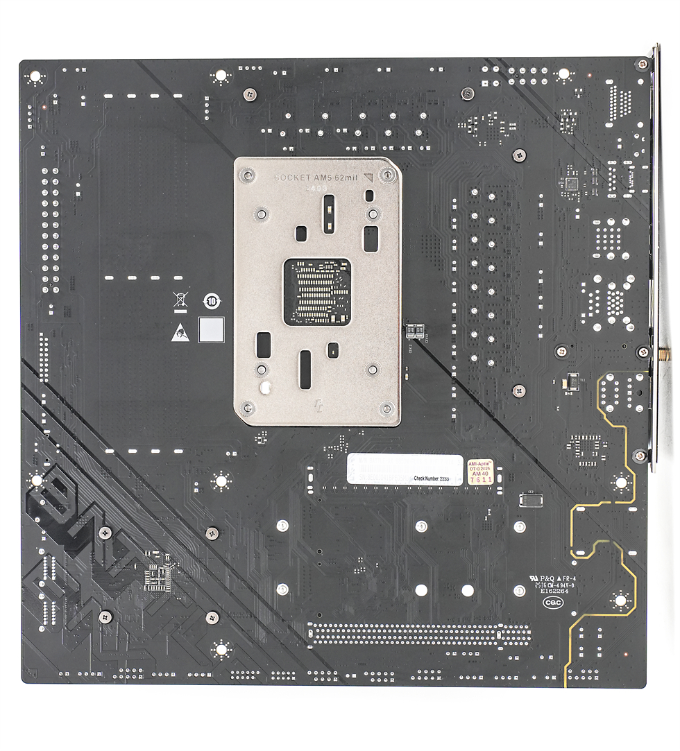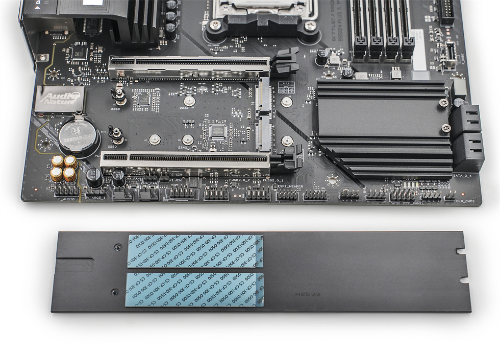 两个全长度的PCIe插槽均采用了合金加固设计,不仅更牢固,还有镜面效果,靠近CPU一侧支持PCIe5.0 x16,另一个支持PCIe4.0 x4。 2个M.2插槽中靠CPU一侧的第一个插槽支持PCIe 5.0×4,第二个插槽支持PCIe 4.0×4。
