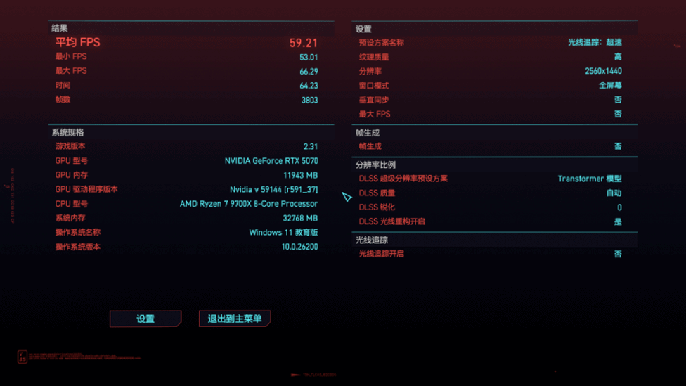 《黑神话:悟空》,2K分辨率,设置具体如上图,大部分是超高,开启DLSS,开启全景光线追踪:中,关闭帧生成,平均帧率67帧/秒;开启帧生成,平均帧率108。古墓丽影:暗影,2K分辨率,设置如上,平均帧率175。荒野大镖客2,设置如上,2K分辨率,预设平衡,平均FPS:109.764;预设拉到最顶,平均FPS:109.96。