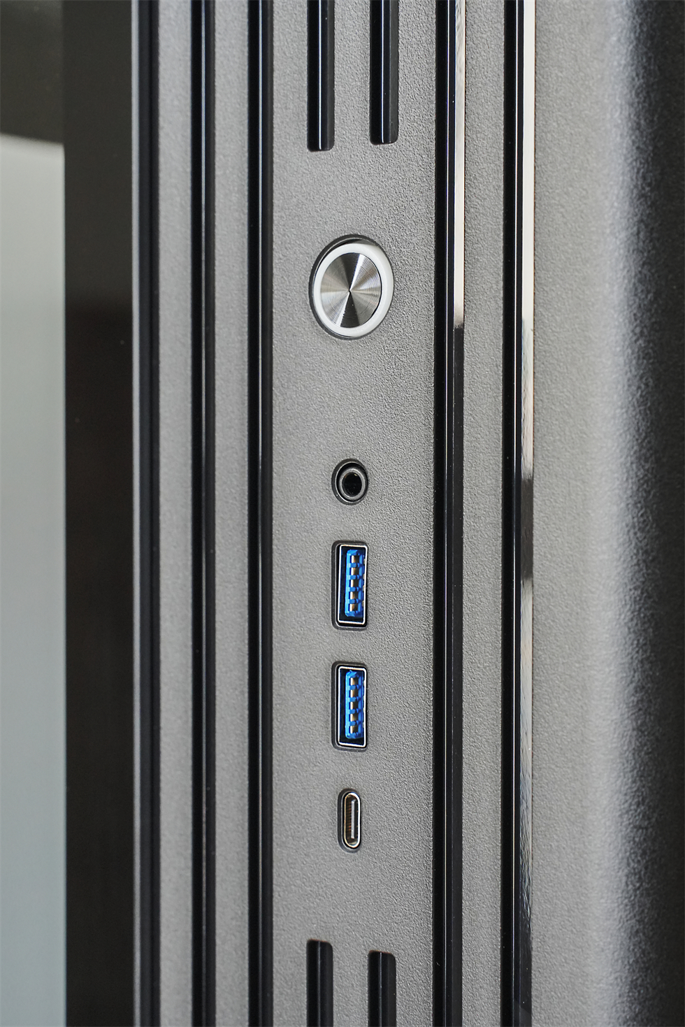 TK-4的I/O区设计在机箱正面的右上侧,由上至下依次为开关键、耳机/麦克二合一接口、2×USB3.0 Type-A(5Gbps)、1×USB 3.2 Gen2 Type-C(10Gbps)。