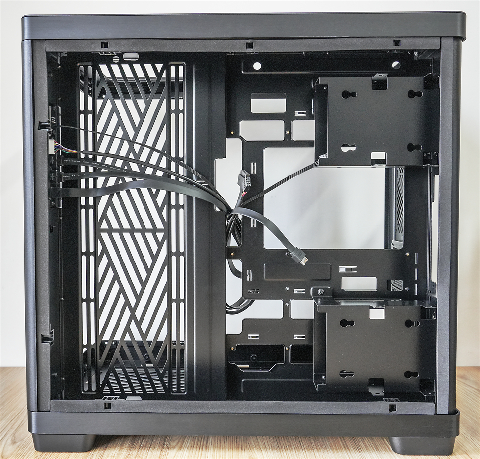 正面内部来一张,空间很宽裕,最大支持ATX主板,而且支持背插主板,顶部、底部都支持安装3×140mm/120mm风扇或是最大420mm的冷排,侧边支持3×140mm(安装30cm长度以内显卡的情况下可安装420mm冷排)或3×120mm风扇,菊花位还能安装2×92mm风扇,11风扇共存轻松达成。