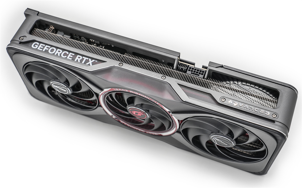七彩虹iGame GeForce RTX 5070 Advanced OC 12GB显卡拥有别致的黑透装甲,整体线条相对柔和而且还有磨砂效果,101mm+86mm+101mm这3个拥有正逆旋转设计的风镰轴流风扇,中间的红圈风扇拥有星环RGB,通电后的双环RGB加上黑透装甲有一流的光影效果,整张显卡长度为343.5mm。