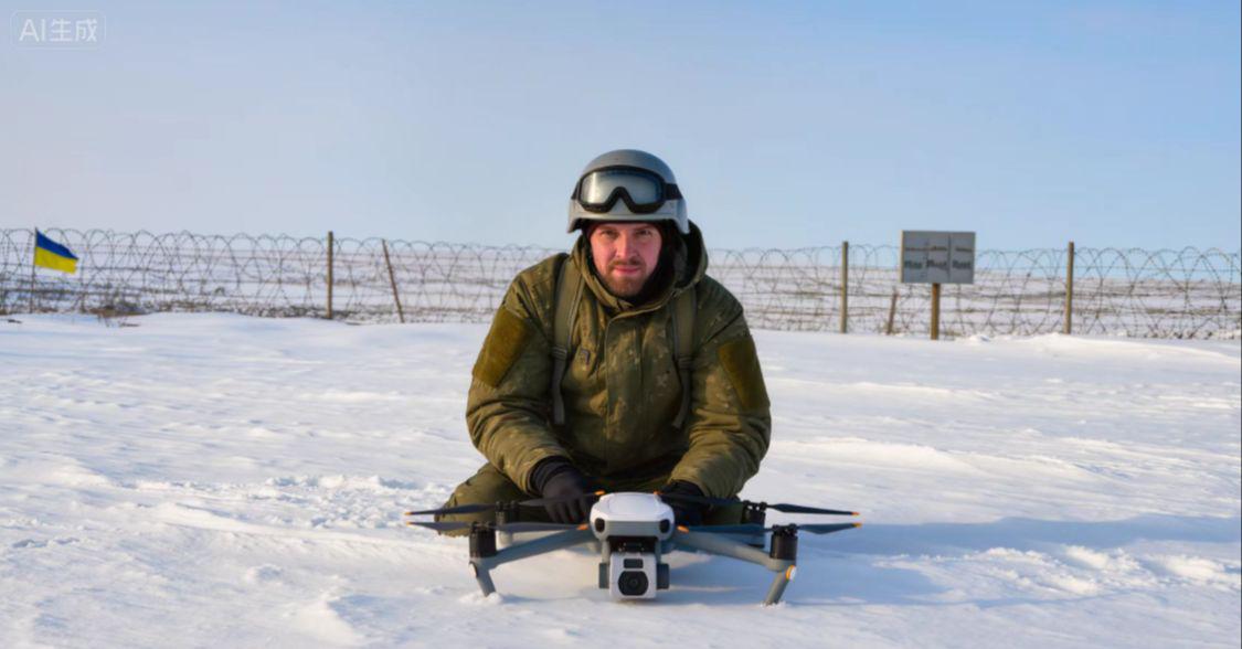 图片描述:乌军士兵在雪地中操控无人机,背景是边境线