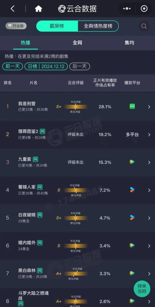 据云合数据显示,截至发稿前,《猎罪图鉴2》正片有效播放市场占有率为19.2%,位列连续剧热播榜第二名。