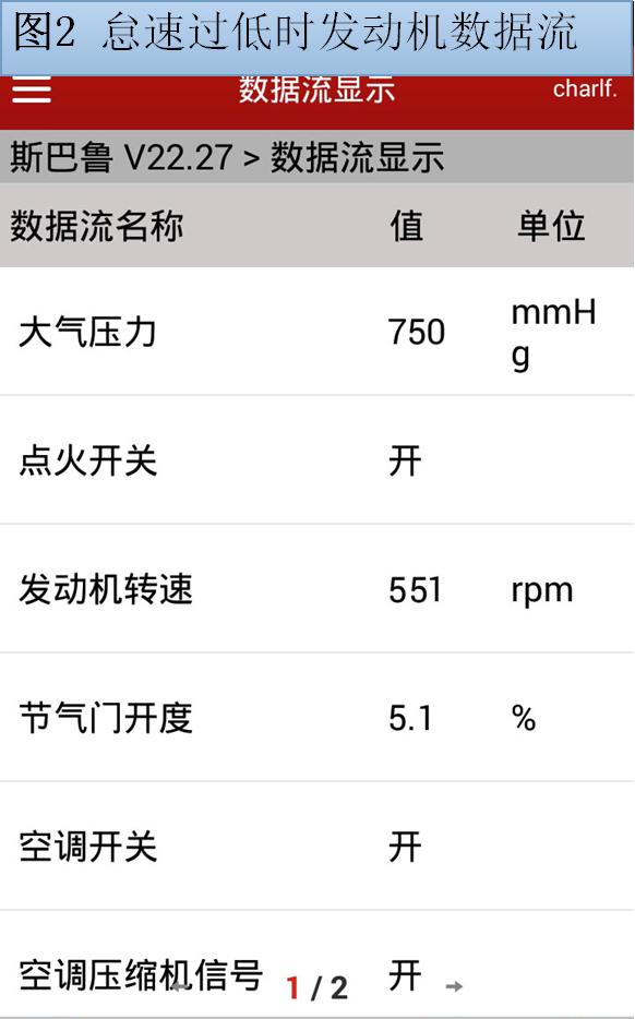 经过8小时,漏气约3kg/cm2,证明还是有其他地方漏。再次分段拆下高低压管、冷凝器、新的压缩机、新的膨胀阀分别打压到25kg/cm2,分段检漏,均无泄漏地方。最后不得以,拆解仪表台拆出蒸发箱。最后发现蒸发箱也有漏的地方,把蒸发箱打压到25kg/cm2泡进水里,会有很微小但持续的气泡从在蒸发箱进出口附近冒同来,不小心根本看不到(各系统泄漏位置见图1)。在100%确定系统部件再无泄漏的情况下,更换了整个系统接口的密封胶圈,把整个系统装起来,打压至25kg/cm2,经过8小时的检测,无泄漏。抽真空后经过1小时也没有漏气,按规定加注了冷媒油与冷媒,打着车打开关空调与风机档位开关,发现空调磁吸不吸。经检查,空调高压管上的压力传感器没有接上,接上后,空调压缩机正常吸合,但是感觉发动机明显动力不足的样子!停机后再打火,发动机明显动力不足,怠速转速明显不正常,介于1000转与0转中间,用X431PRO进发动机数据流发现只有550转/分左右(图2),节气门开度5.1%有问题。