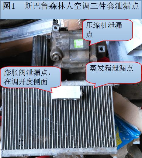 故障现象:一辆2008年的斯巴鲁森林人,VIN:JF1SH52F19Gxxxxxx,2.0L排量,普通定排空调,由于空调冷媒泄漏不制冷进厂维修。此车去年就因为空调不制冷,为漏冷媒,去年夏秋季在我厂每月加1~2支冷媒,但是车主没有时间给我们对空调系统进行全面的检修。拖到今年出差广州才决定把车留在我厂对空调系统进行全面的检修。