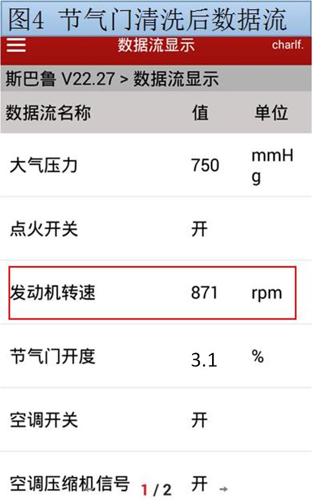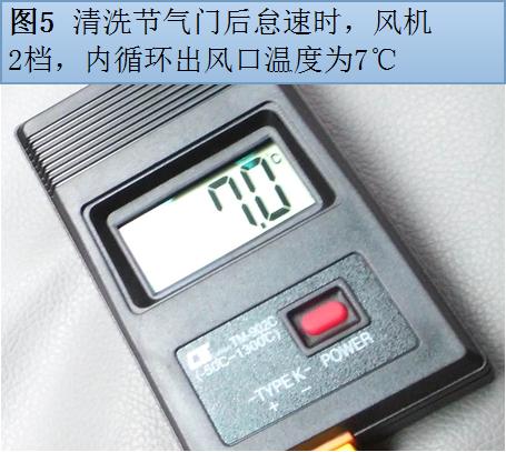 从图上用过的布我们可以想象节气门清洗前有多脏!完全清洗节气门后打火,从高怠速约1200RPM慢慢的回落到870PRM左右,正常!(图4),与未清洗前,其他数据一样,只是发动机转速从555转左右变为了870转左右,节气门开度为3.1%。空调也从按下空调开关与风机档位开关就工作,发动机运转平顺,风量2档时用温度表量取怠速时仪表台前各出风口温度,为7℃左右,合格。(图5)